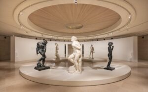En arrivant au début de l’exposition, les visiteur.euses se retrouvent face à une rotonde qui supporte le poids de cinq statues masculines, toutes tournées vers l’extérieur. Certaines œuvres sont de Michel-Ange, d’autres de Rodin, et l’ensemble paraît sur le point d’exécuter une danse de bienvenue aux nouveaux et nouvelles arrivant.es.