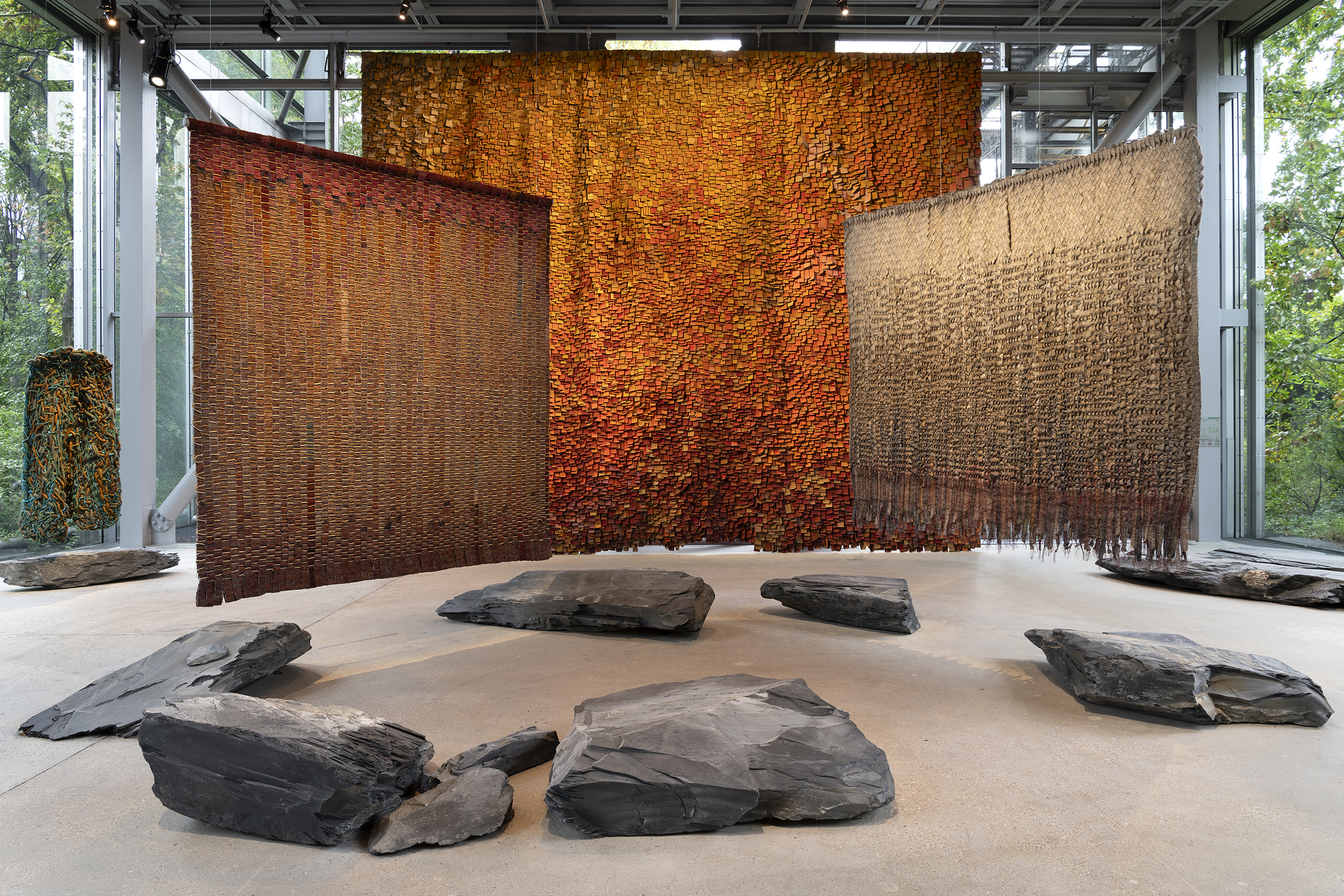 Elle a composé un paysage ponctué de pierres d’ardoise qui dialoguent avec les œuvres monumentales d’Olga de Amaral. Suspendues, celles-ci incitent à des moments de méditation et de contemplation, à un voyage, à un cheminement dans une densité de couleurs qui sont soit disposées selon un camaïeu, soit contrastent ensemble. Leurs compositions de différentes matières, de rythmes colorés peuvent faire songer à des paysages naturels où la lumière est très présente. Lina Ghotmeh précise dans un texte que l’artiste a souvent photographié ses œuvres dans la nature. Ses œuvres Muro en rojos (Murs rouges) et Gran muro (Grand mur), réalisées à partir de bandes rectangulaires monochromes, de différentes longueurs et épaisseurs, cousues une à une et de manière irrégulière sur un support de coton peuvent suggérer des murs en briques typiques des constructions colombiennes. On peut aussi y voir des amas de feuilles. Cette première salle provoque en nous une expérience réjouissante, captive notre attention et convie notre imagination à nous projeter dans toutes sortes de milieux naturels. On observe les jeux de tissage, de tressage et de nouage avec curiosité et fascination.