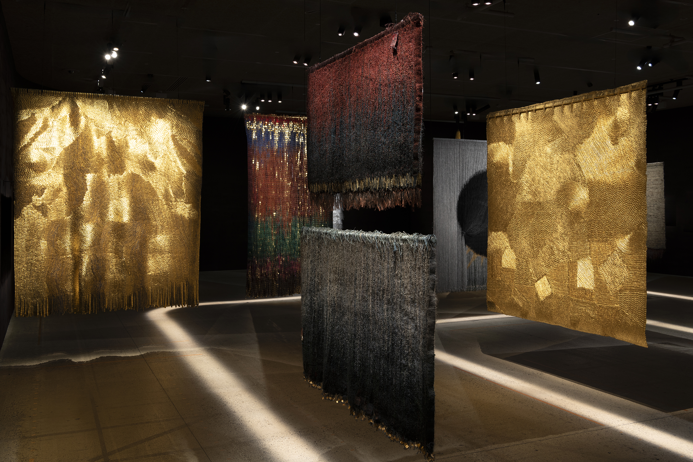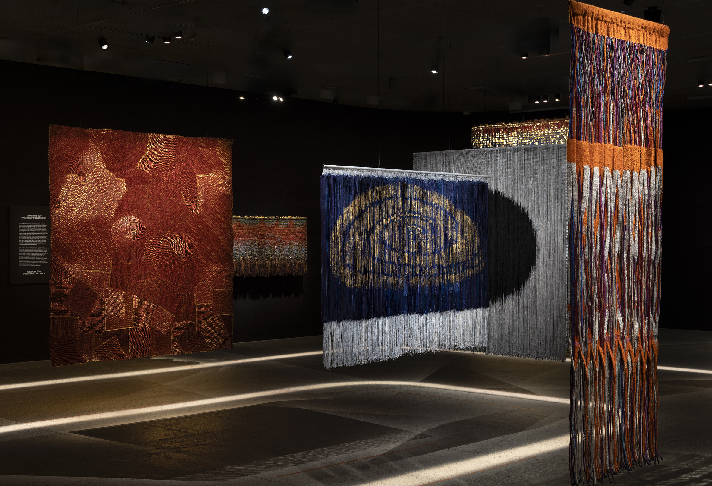 Au sous-sol, les œuvres sont installées de manière à proposer une circulation inspirée du motif de la spirale très présent dans les œuvres de l’artiste. Nous pouvons également avoir un rapport de proximité avec les œuvres, découvrant à la fois l’endroit et l’envers de celles-ci. Les jeux d’ombre et de lumière là encore dessinent un rythme d’obliques au sol. Olga de Amaral a expérimenté un grand nombre de techniques et de matières, nourrie par l’héritage du modernisme et du Bauhaus ainsi que par son expérience de son territoire d’origine. Son approche des matériaux lui permet de créer du volume, des textures plus ou moins épaisses. Elle utilise également la feuille d’or dans certaines de ses pièces textiles, en écho aux autels des églises catholiques baroques de Bogota et à l’orfèvrerie précolombienne. Face à ces œuvres, nous pouvons percevoir une lumière changeante, qui appelle à se recentrer sur ses émotions et à laisser son imagination nous emporter ailleurs. Pour l’artiste, le textile constitue une forme de langage et certaines de ses œuvres portent en elles l’idée de la transcription, du récit, telles Escrito 19 et Memorias 3. L’intérêt de l’artiste pour la nature et son attachement à son territoire d’origine se révèle notamment au travers d’œuvres aux titres évocateurs et dont les couleurs peuvent évoquer des strates, des montagnes, des chutes d’eau.