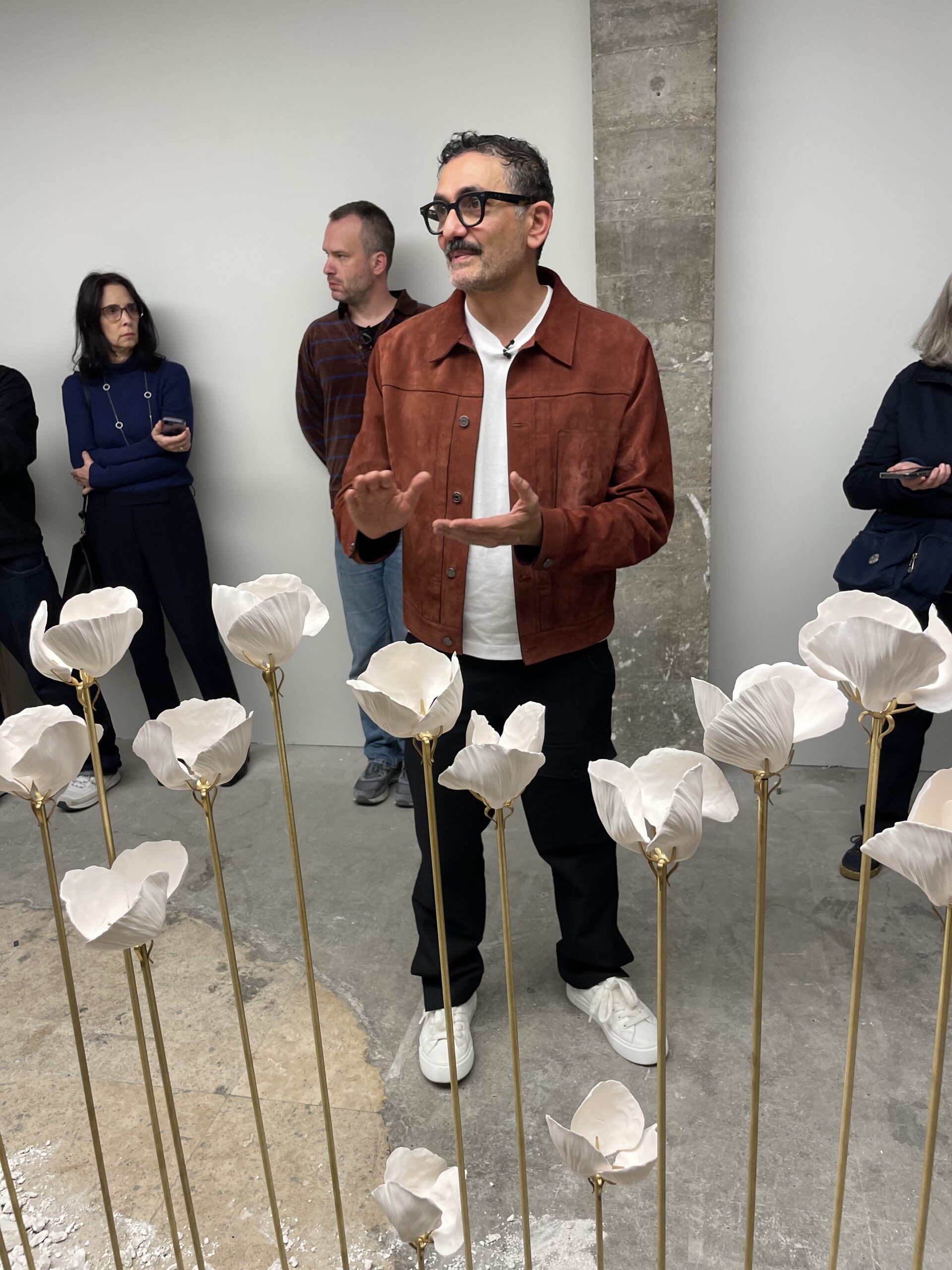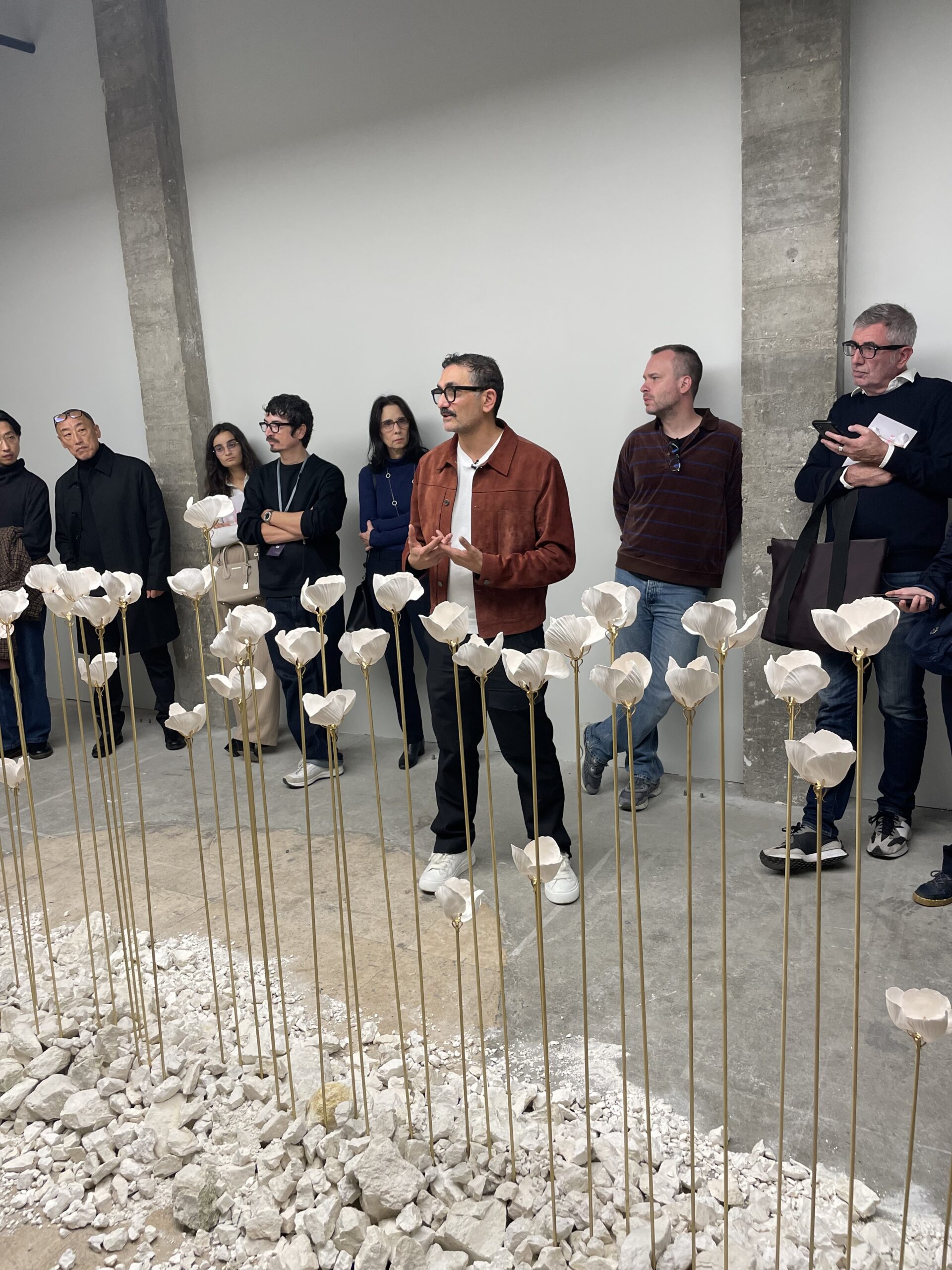 L’exposition s’ouvre sur « Éclats de rose », installation spectaculaire exposée précédemment au West Bund Design de Shanghai. Une route de la soie composée de roses blanches en porcelaine serpente dans l’espace, évoquant à la fois la fragilité de la fleur et son statut mythique. Ces roses presque sans couleur possèdent pourtant une présence incroyablement gourmande, comme si leur blancheur de porcelaine concentrait toute leur essence olfactive.