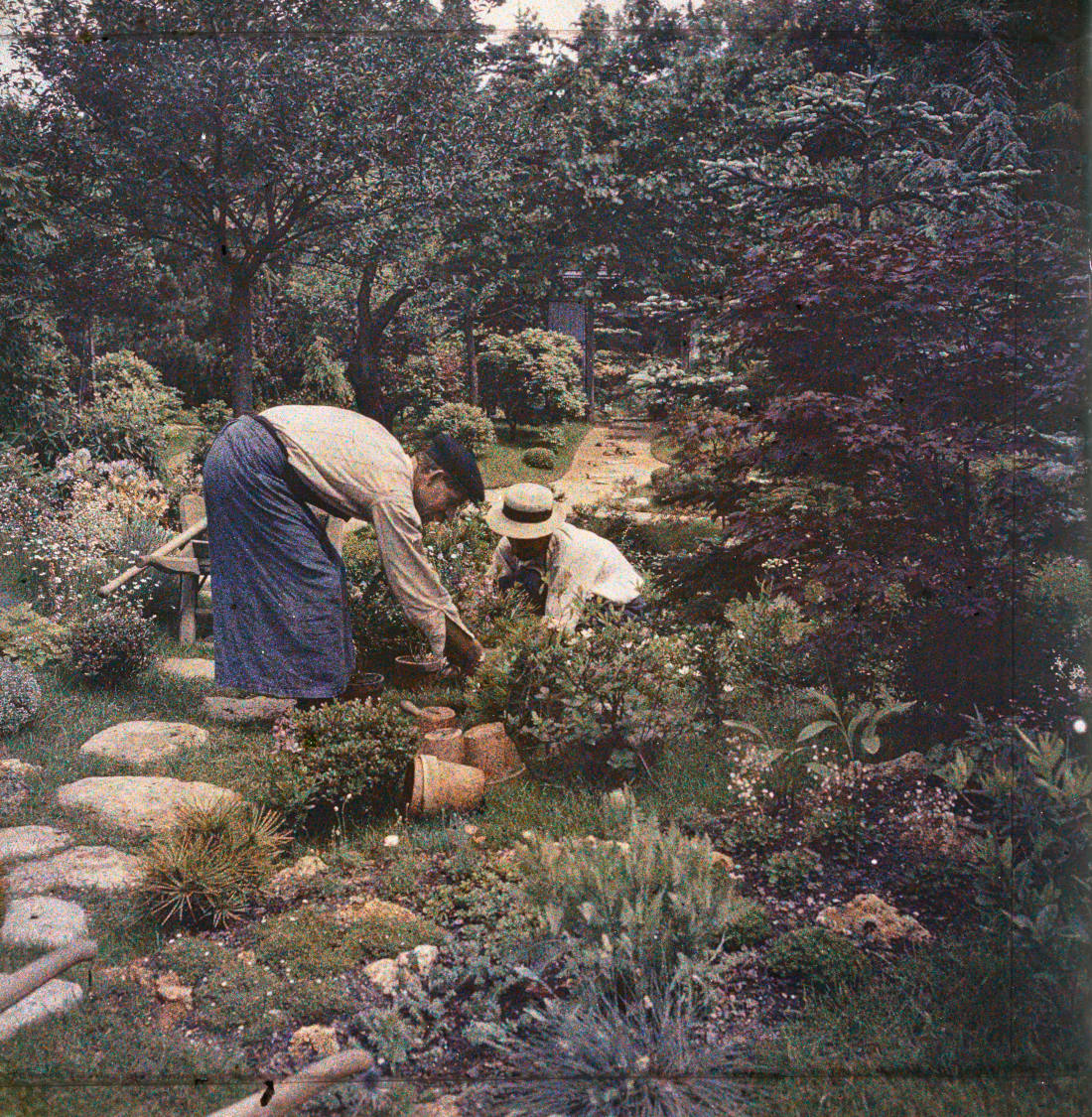 2- Deux jardiniers dans le jardin japonais, Propriété d’Albert Kahn à Boulogne, Entre 1909 et 1912, Stéréo autochrome © CD 92 / Musée départemental Albert-Kahn