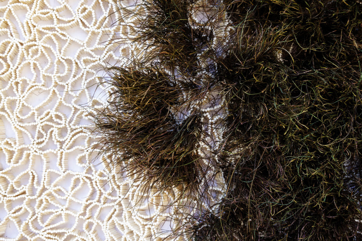 Le lien le plus évident entre artiste et nature est quand celui-ci la prend pour sujet de son œuvre. La représentation est plus ou moins abstraite, comme la sculpture de formes dansantes de Stéphane Erouane Dumas installée dans le parc qui évoque la minéralité des falaises normandes, et utilise tous les mediums à disposition, tels que l’IA et les outils numériques dans les quatre saisons de Miguel Chevalier. La nature est représentée, imaginée, extrapolée, tout en étant un peu gardée à distance. Tout comme pour les peintures de paysages éthérés et sensibles de Yann Lacroix, la nature est le sujet, mais elle est aussi un support à l’expression d’émotions et de sensations propres à l’artiste, une sorte de portrait de sa mémoire en creux.