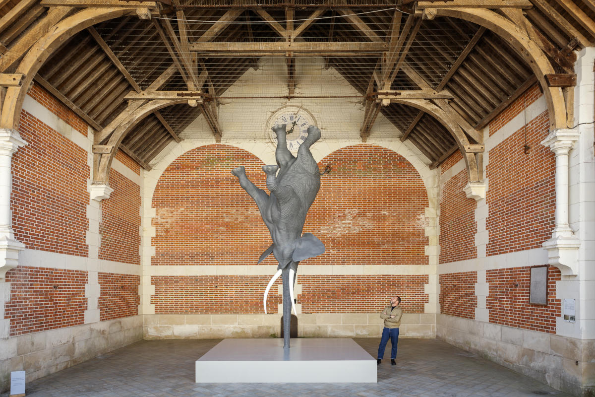 Le grand éléphant de Daniel Firman, en équilibre sur sa trompe, est quant à lui le fruit d’une démarche zéro déchet. En effet, il est entièrement imprimé en 3D, technique où il n’y a pas de perte de matière et qui utilise l’électricité, une énergie renouvelable. Mais c’est sûrement la démarche de Vincent Laval qui a l’impact environnemental le plus faible. Il collecte patiemment des branchages tombés dans la forêt de Carnelle pour les assembler en cabanes, la forme archétypale du retour à la nature. Sa création suit les rythmes de la nature et nous fait prendre conscience du rapport d’échelle entre l’humain et l’ensemble du vivant.