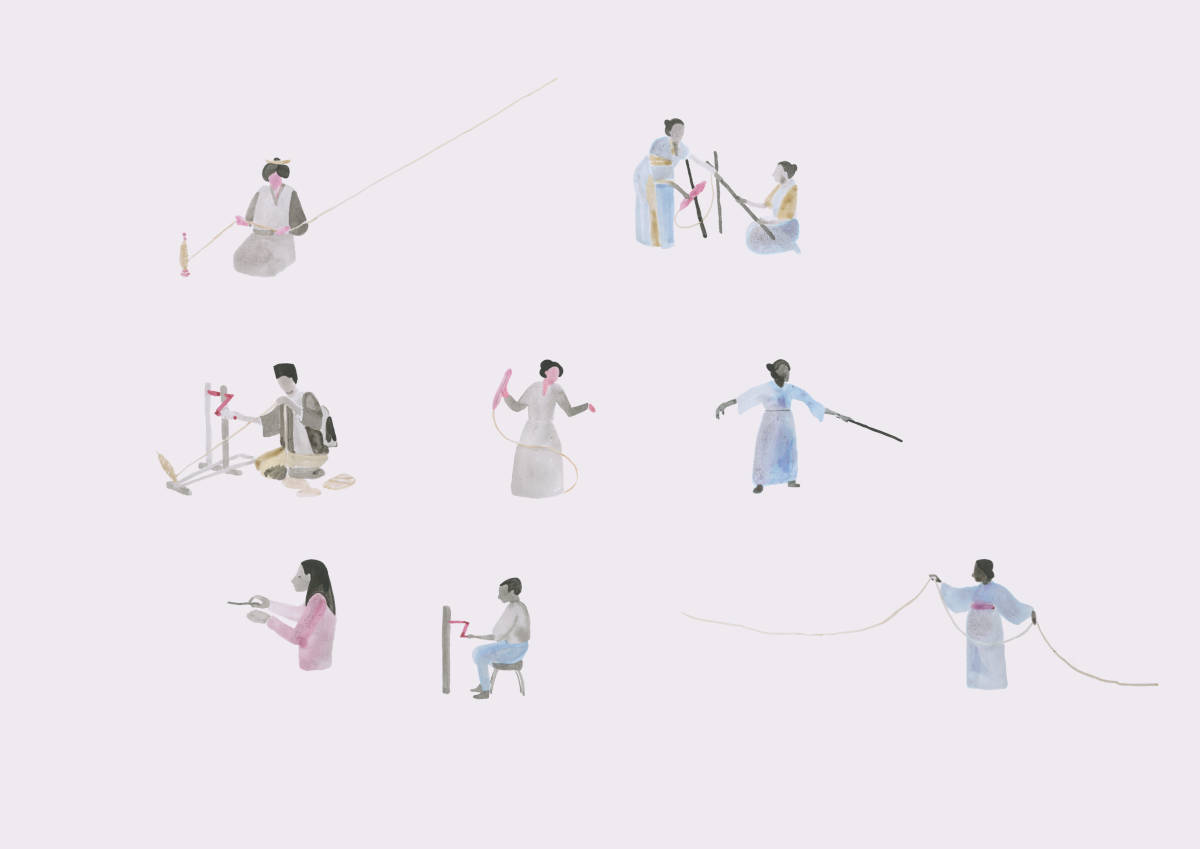 L’exposition se visite en deux temps : les œuvres réelles et l’œuvre virtuelle. La réalité tangible associe des collections de choses, de mouvements et de personnages à l’aquarelle dans un style qui rappelle Brecht Evens, un grand métier à tisser jacquard aux cartes immobiles percées de kanas, des paravents zébrant l’espace de leurs fils tendus, de vidéos d’animation et de sérigraphies. Si on peut se demander au premier abord ce qui relie ces éléments disparates, on se rend ensuite compte qu’ils constituent une sorte de répertoire de formes, d’idées et d’expérimentations pour Boris Labbé. Reprenant le style de Sei Shonagon, il dresse la liste des choses qui s’imbriquent dans son projet, fait crépiter les calligraphies japonaises, décompose les mouvements, fige l’action ou anime les décors.
