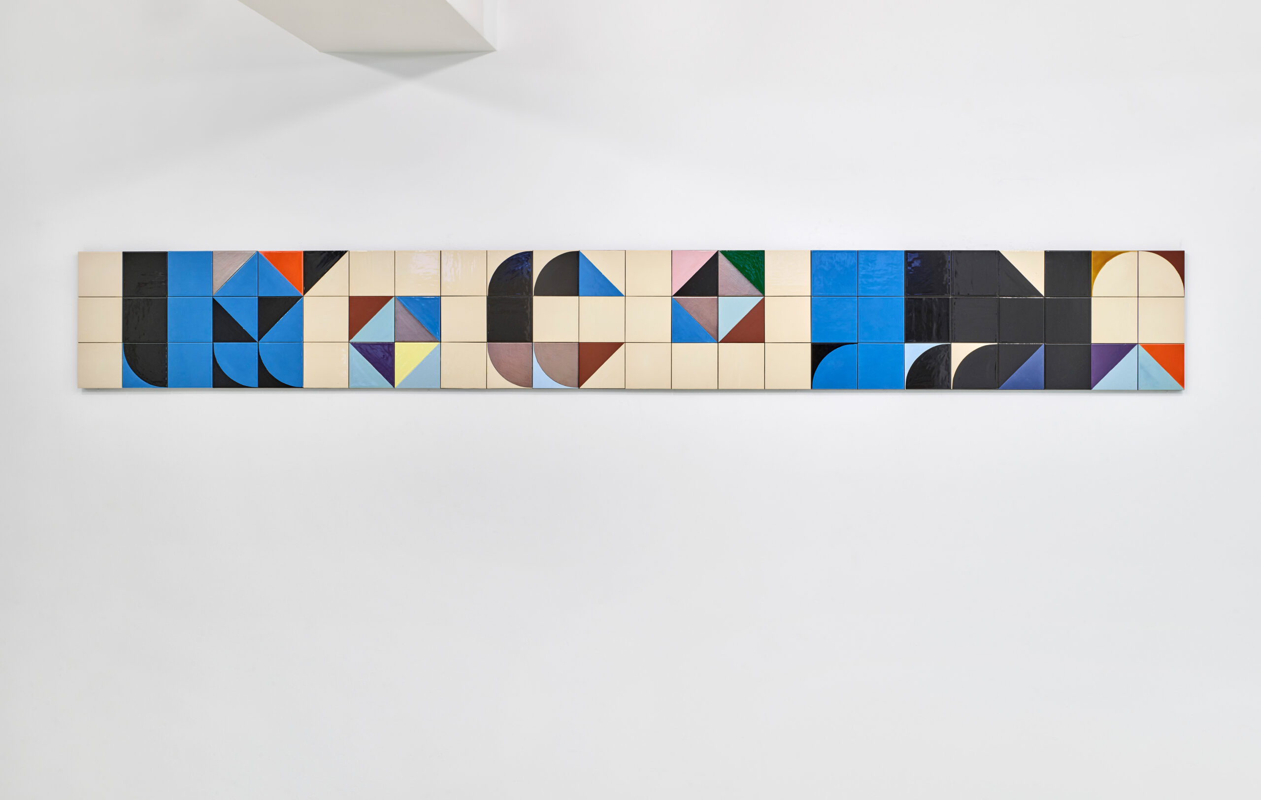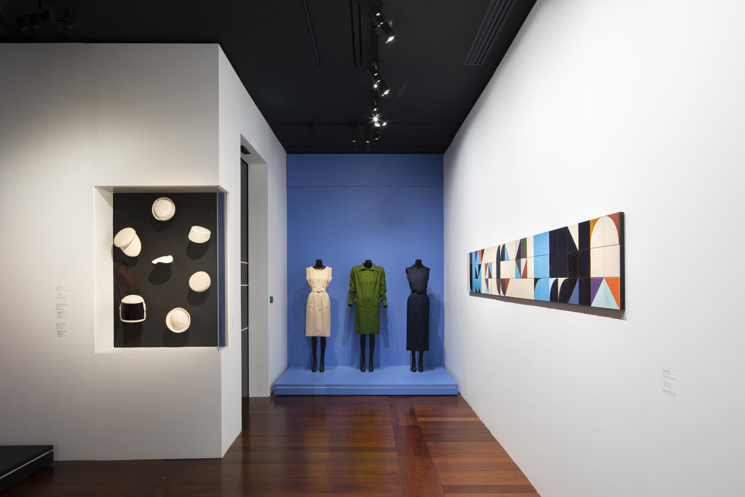 Dès la première salle, il ne fait aucun doute du sens pointu de Claudia Wieser pour l’espace comme les couleurs. Ce sont ses carreaux de céramique qui nous accueillent, les aplats de couleurs font échos aux silhouettes monochromes, les lignes brisées s’harmonisent avec les courbes, la dynamique visuelle est forte. Deux ensembles de chapeaux se font face : d’un côté des chapeaux noirs de différentes formes sur fond blanc, de l’autre des couvre-chefs blancs sur un aplat noir. Ainsi, toutes les formes pures individuelles de la salle prennent forme ensemble.