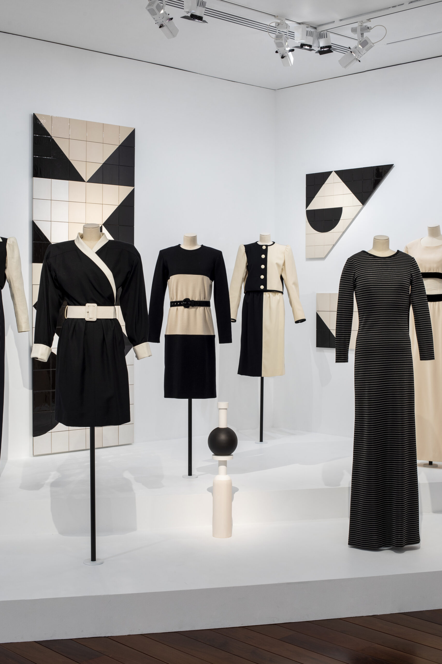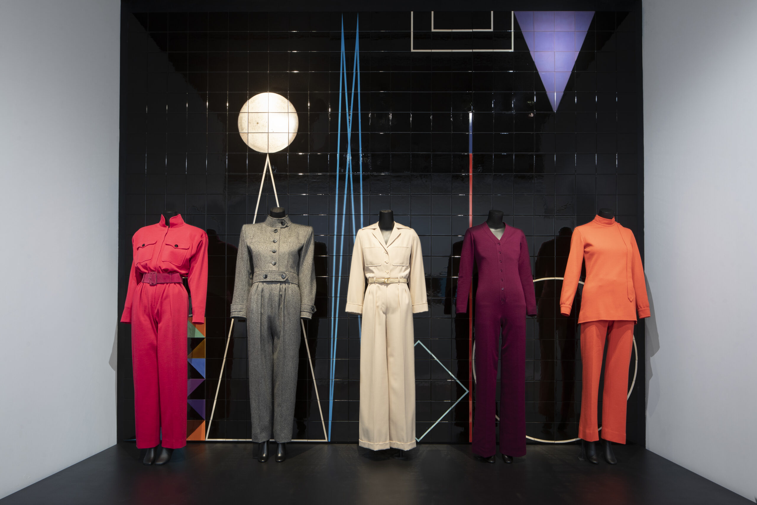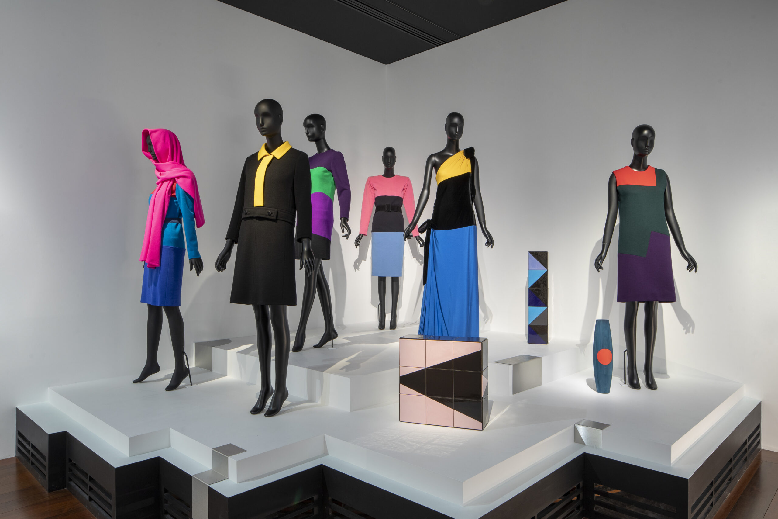 Puis vient le choc de la juxtaposition de couleurs vives avec six mannequins sur une estrade dialoguant avec des sculptures de Claudia Wieser. Ce sont cette fois les empiècements cyan, fushia, vert, ou jaune canari qui sont à l’origine de la composition de formes saturées. Rigueur de la coupe et fantaisie chromatique mettent en avant l’avant-gardisme de Saint-Laurent ainsi que son attrait pour l’art abstrait. C’est un réel bonheur que de se délecter du talent de coloriste du couturier.