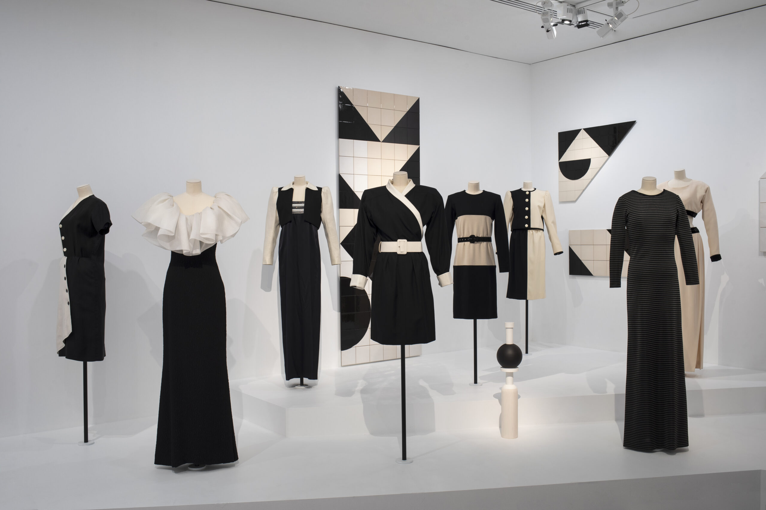 Indéniablement la salle la plus extraordinaire est celle dédiée au noir et blanc. La profusion de silhouettes graphiques répond aux œuvres contrastées de Claudia Wieser. Les lignes sont nettes, les formes distinctes, les coupes impeccables. Une compilation de dessins vient d’ailleurs appuyer les tracés de Saint-Laurent. On y retrouve le geste créateur, le noir sur blanc pour définir la forme et l’esquisse avant la toile en trois dimensions. Les rayures côtoient des jeux de matières, de symétrie, et il semblerait que cette thématique a été pour le couturier, comme elle l’est pour l’artiste berlinoise, un fabuleux terrain de jeux. Dans le studio de la maison de couture trône la veste Mondrian.