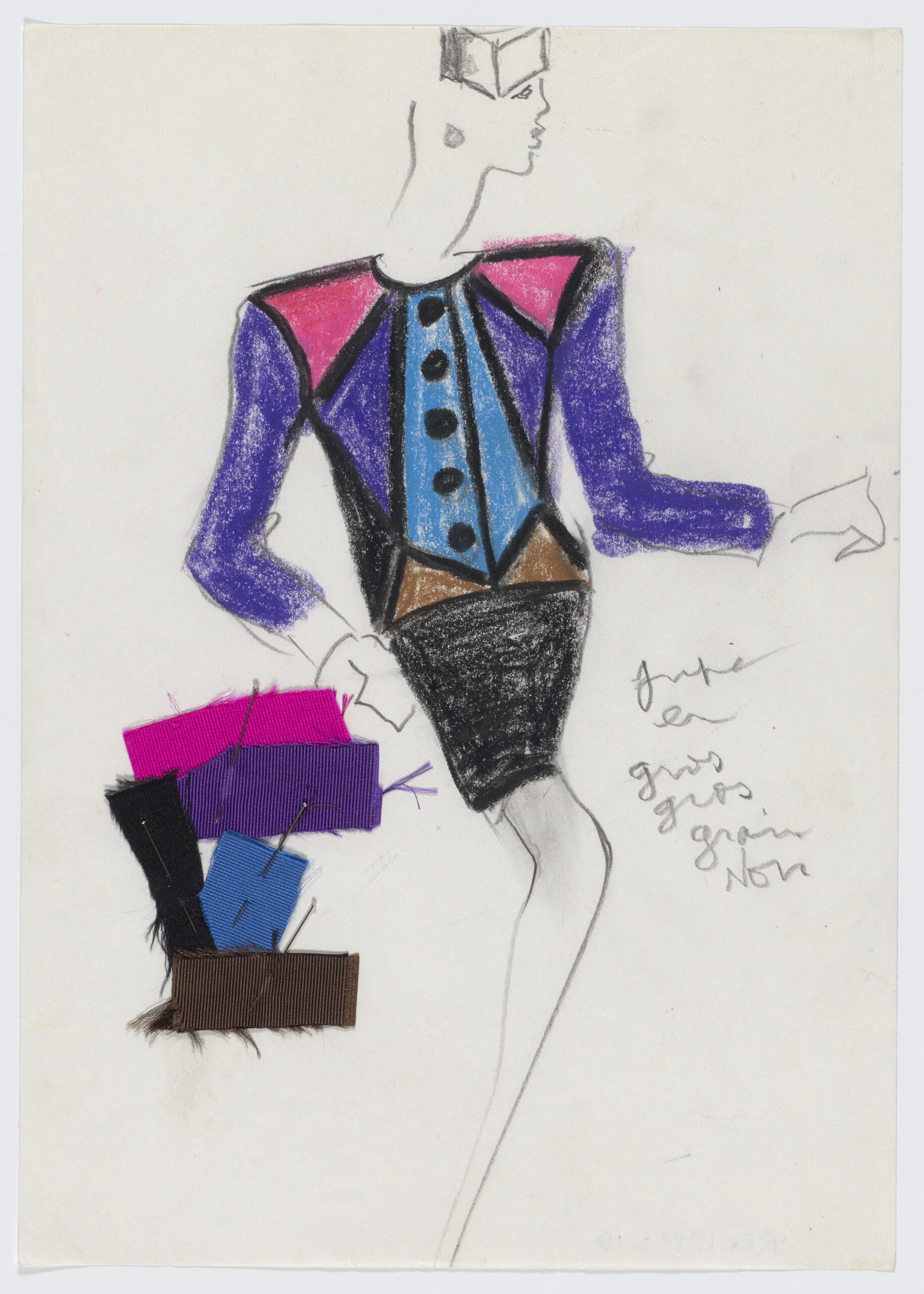 Et évidemment, chaque création contemplée séparément est un régal pour les yeux. Une combinaison en jersey de laine rose de 1984 et une seconde en gabardine de laine beige datant de 1975 témoignent de la verticalité des silhouettes dessinées par Saint-Laurent. Tout est question de lignes pour atteindre la pureté de la construction, ici en empruntant des vêtements au monde du travail pour les adapter au vestiaire féminin. Des “formes permanentes”, utilisées dans l’aviation notamment, qui deviennent ici des ensembles sublimant le corps.