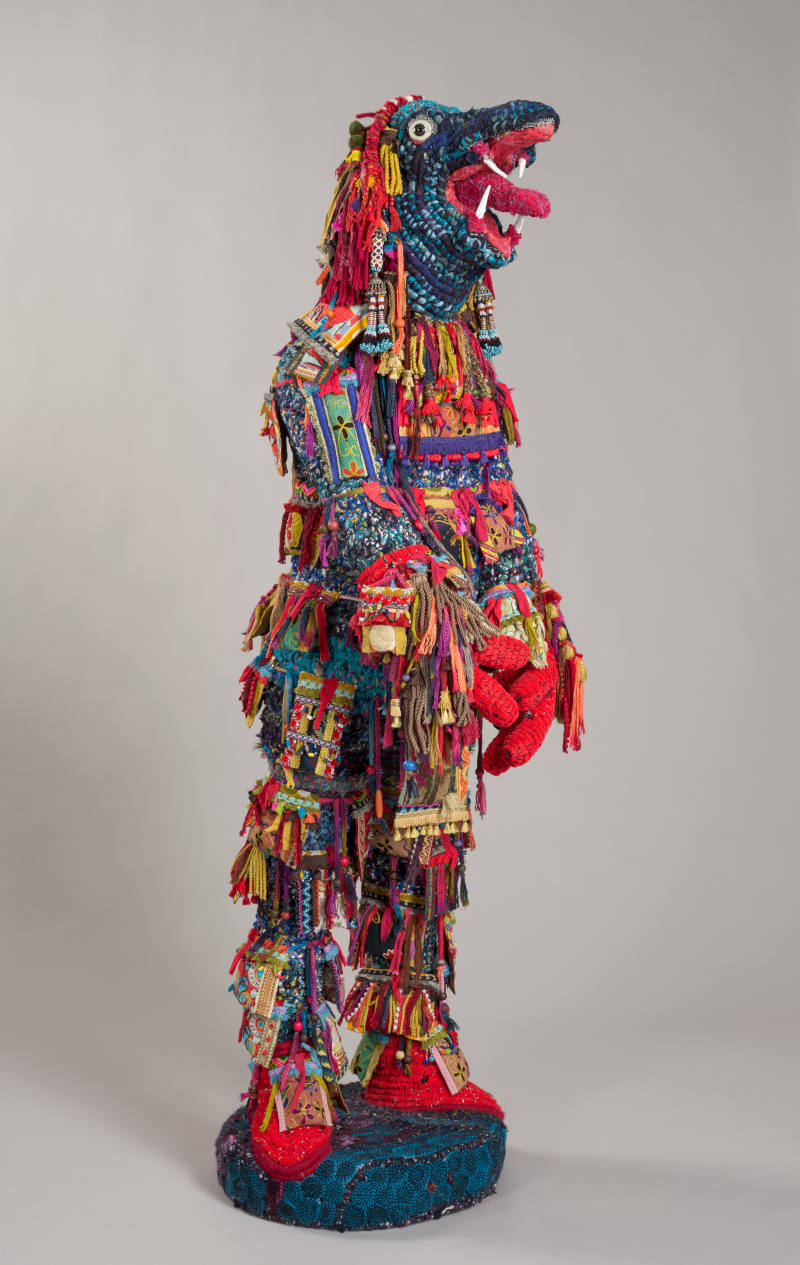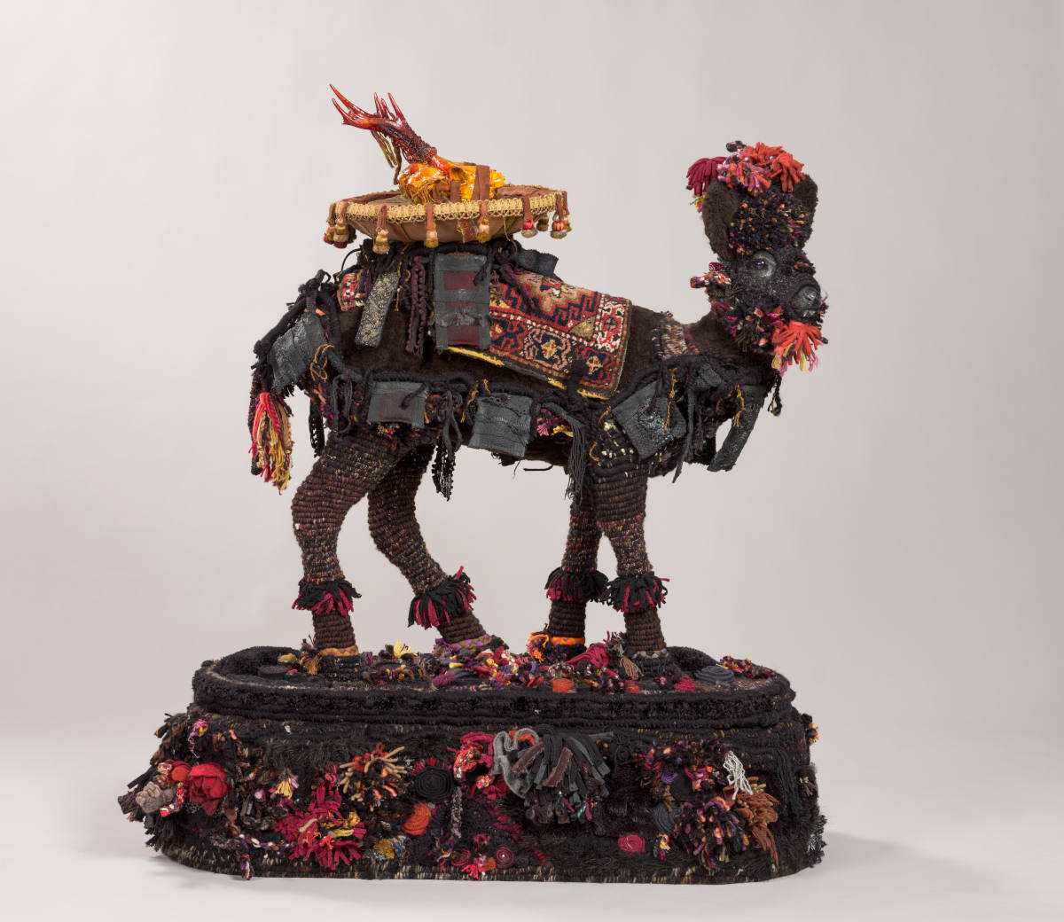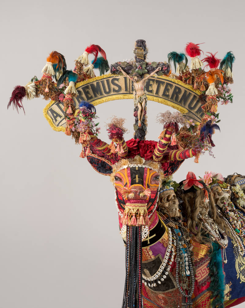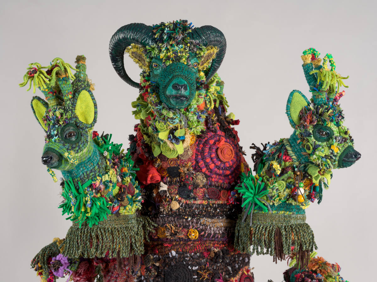 C’est un groupe d’êtres hybrides qui nous accueille, les yeux de verre dirigés vers nous, leurs couleurs vives emplissant l’espace. Peu à peu, dans ce fourmillement de formes et de couleurs, se dessinent les contours de créatures fantastiques à la fois animales, végétales et totémiques. Depuis une dizaine d’années, depuis qu’il a retrouvé des dépouilles momifiées de petits animaux lors de travaux, Benoit Huot modèle ses créatures à partir d’animaux taxidermisés, des cerfs, sangliers, biches ou bouquetins. Il les recouvre de tissus, objets et ossements glanés dans les vide-greniers, mariant les motifs et les matières. Entre les œuvres les plus anciennes de 2012 et celles d’aujourd’hui, on peut voir sa pratique s’orienter de plus en plus vers le tissage, la fabrication de cordes de laine et de textile venant habiller et modifier l’animal.