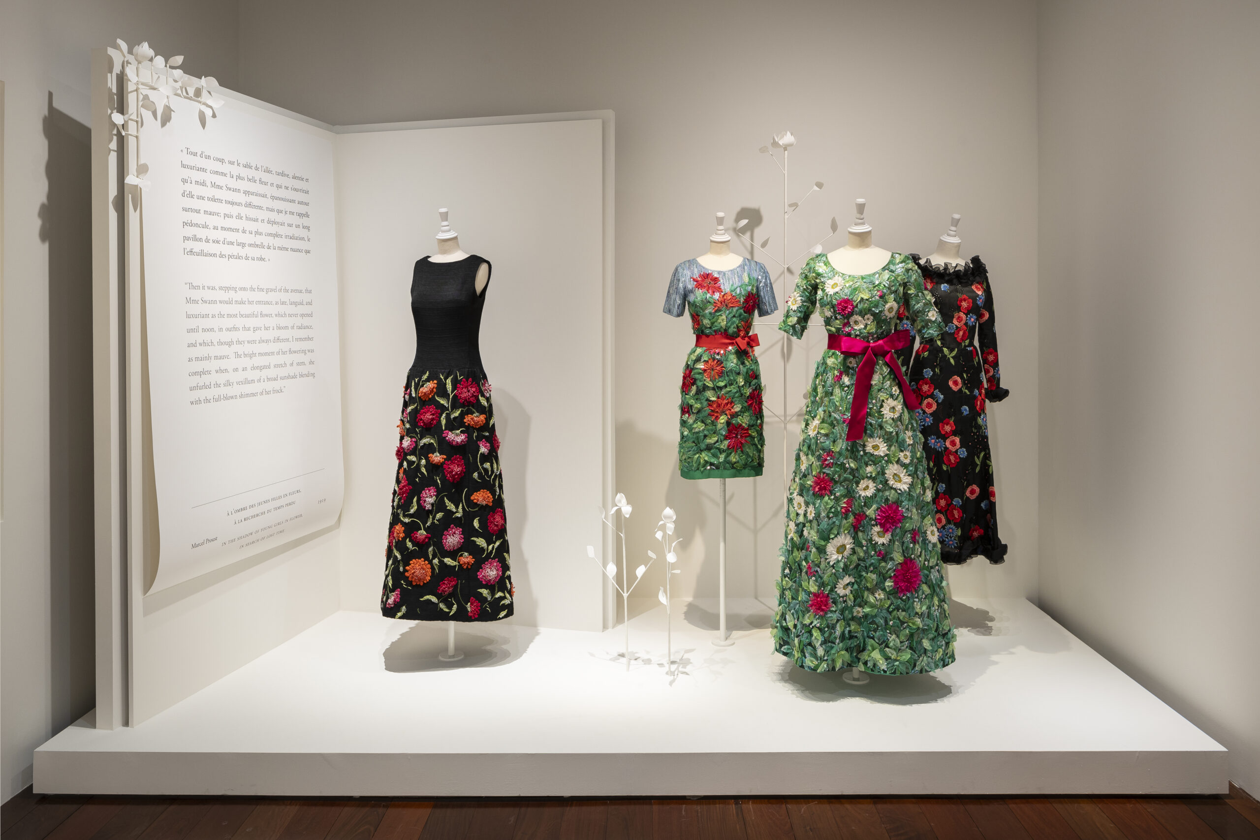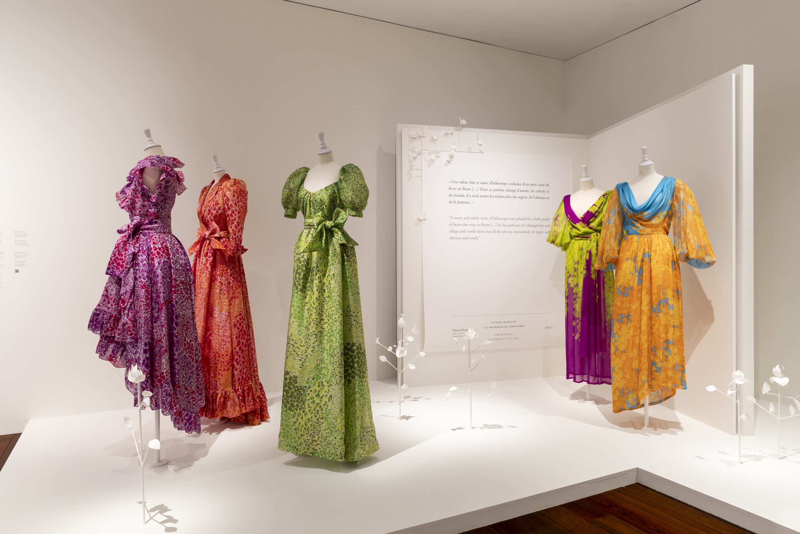 Avec son partenaire Pierre Bergé, Yves Saint-Laurent vivait entouré de fleurs et de jardins, où il trouvait une source considérable d’inspiration. Il partageait son intérêt pour la flore avec l’écrivain Marcel Proust. D’où le parti pris curatorial d’associer dessins, créations textiles et citations de l’auteur. Les robes d’Yves Saint-Laurent se portent tels des jardins où la flore colorée est en majesté et révèle son éclat, autant que son caractère éphémère. Celles-ci sont ornées de broderie, d’organdi de soie, à l’image de fleurs délicates.