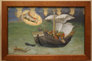 Scomparto di predella con Storie di San Nicola : il Santo salva una nave dal naufragio, 1425, tempera et or sur bois, 39,5 x 62,5 x 3,8 cm