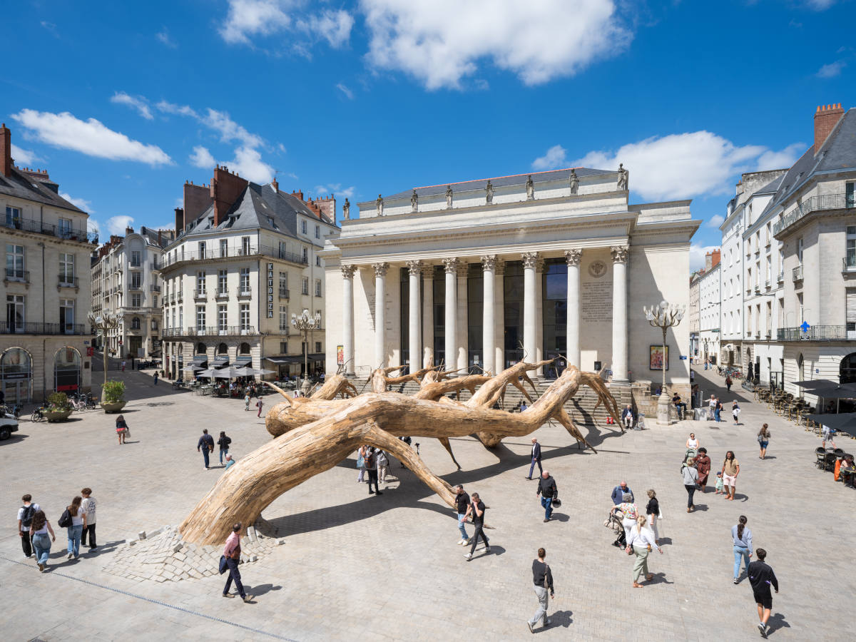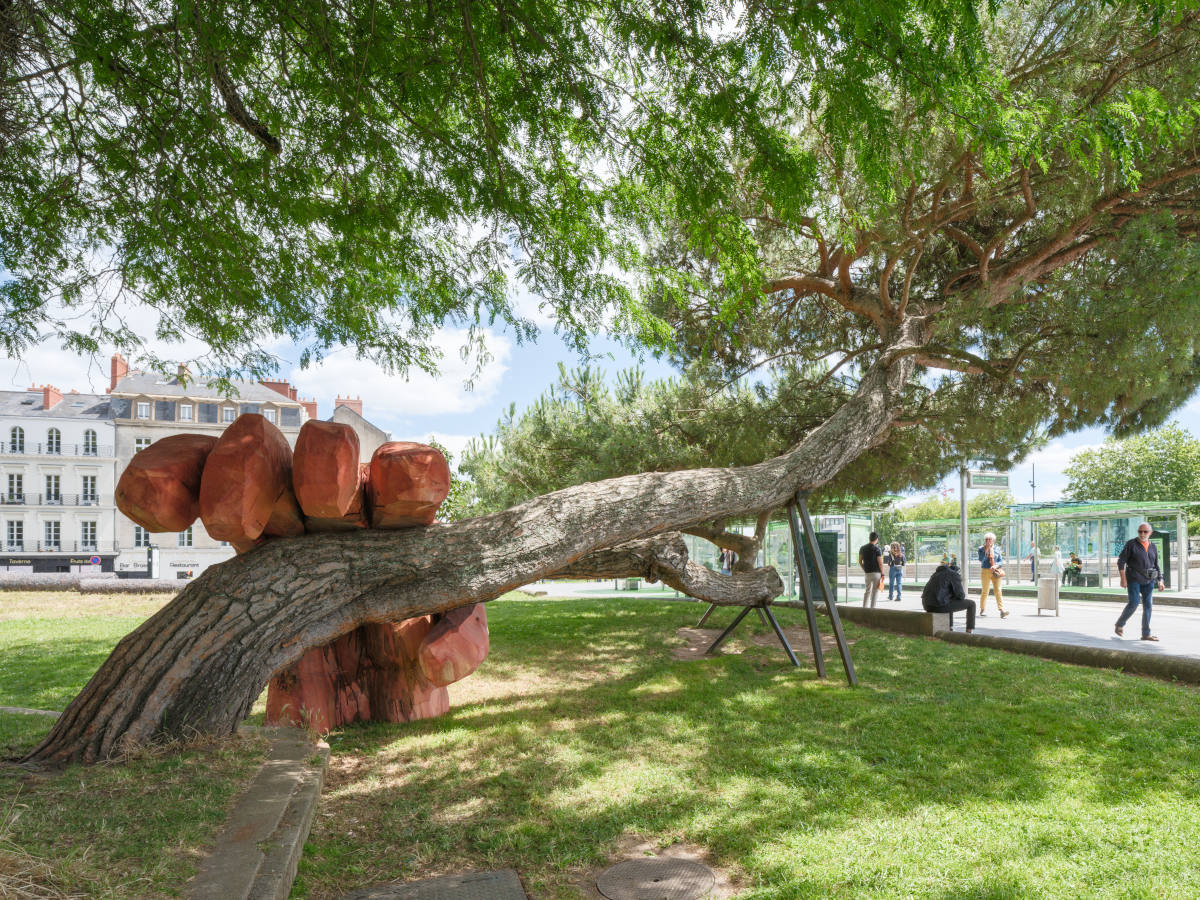 Mais tous ne se sont pas appuyés sur les arbres existants. Jean-François Fourtou par exemple a rapporté du Maroc où il vit un enfant mi humain, mi palmier qui attend l’heure du coucher au milieu de la minéralité de la place Royale. Place Graslin, Henrique Oliveira fait surgir de sous les pavés une racine qui part à l’assaut des marches du théâtre, telle une main de bois recomposé, un animal végétal à la puissance qui pourrait détruire. Fabrice Hyber a quant à lui reproduit son homme de Bessines en grand format en assemblage de bois tombés à Nantes au milieu du massif armoricain du jardin botanique. L’eau qui s’écoule de la sculpture la rendra peu à peu verte de mousses, mettant en avant le lien essentiel du végétal et de l’eau.