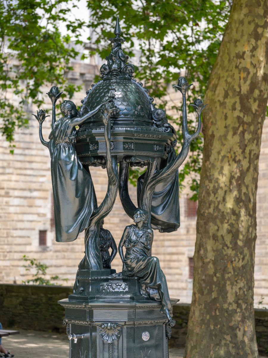 L’eau dans la ville et l’accès de tous à l’eau potable sont des problématiques majeures de santé publique. Ainsi, Claire Tabouret installe une statue de deux baigneuses dans la fontaine venant occuper la niche des anciens Bains-douches construits après le comblement d’un bras de la Loire. Détournant la fonction hygiéniste du lieu par les maillots de bain à rayures des jeunes filles, la sculpture instaure un lien à l’eau plus ludique. De même, l’auteur de bande dessinée Cyril Pedrosa apporte une note de fantaisie à la célèbre fontaine Wallace, dessinée à l’origine par le nantais Charles-Auguste Lebourg. Il compose un récit d’évasion des cariatides en quatre chapitres dispersés dans la ville, se libérant du poids d’être muses, ajoutant à un projet urbain une dimension actuelle et poétique.