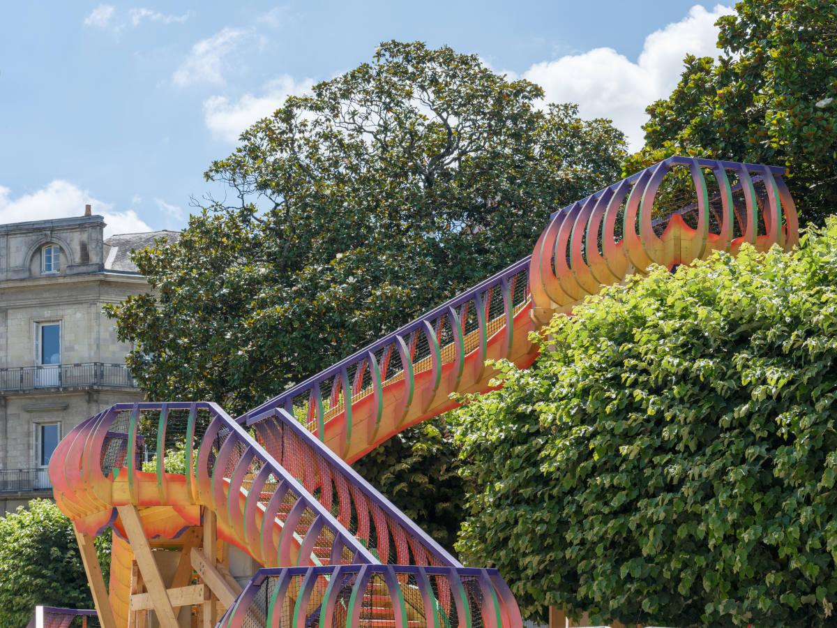 Le parcours nous entraîne donc à la rencontre d’arbres vénérables tels que les quatre tilleuls formant une marquise au-dessus de l’entrée du cimetière de la Bouteillerie, sous lesquels Aurélie Ferruel et Florentine Guédon installent un récit autour des graines de tilleul et des glaneurs fossilisés dans la pierre. Au pied du château, Max Coulon joue avec un pin parasol couché qu’il enserre d’une main géante taillée dans un séquoia récemment abattu dans la région, à l’odeur encore forte et d’une surprenante couleur rouge. Cours Cambronne, les designers Barreau Charbonnet nous offrent la possibilité de grimper leur escalier-belvédère en bois coloré pour admirer la floraison des magnolias de près. Square Schwob, c’est un autre pin parasol qui porte la sculpture de Yushin U Chang préfigurant en coupe la croissance d’un arbre qui peut vivre 250 ans.
