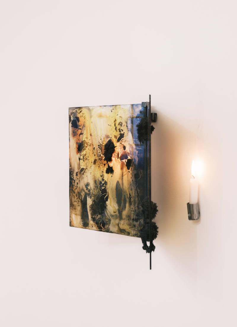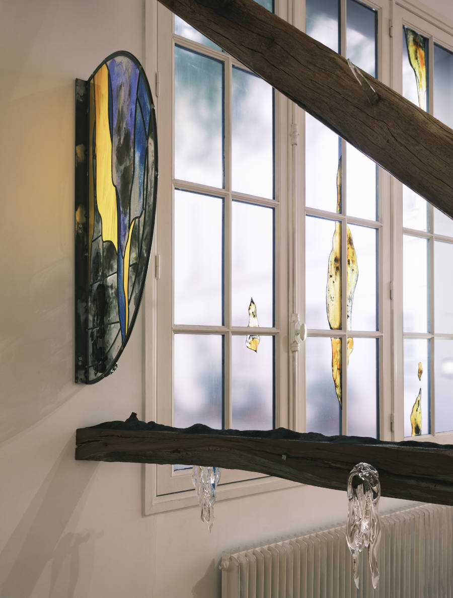 Cette exposition est une grande et belle déclaration d’amour de Marion Flament pour la force qui est à la base de tout son travail : le feu. Elle s’en sert pour façonner le verre et la céramique ou utilise la flamme de la bougie pour peindre à la suie qu’elle cristallise entre deux plaques de verre. Sa gamme colorée est chaude, et même ce bleu qu’elle a commencé à utiliser se retrouve au cœur de la flamme. Son feu est à la fois créateur et difficile à maîtriser, lui qui pourrait tout détruire à la moindre erreur. Mais il est également la source de lumière qui amène les œuvres à la vie d’un souffle insaisissable, qui fait vibrer les couleurs du vitrail de l’œil de bœuf qui éclaire le grenier de l’artiste. Comment ne pas être attiré par un élément aussi volatil, violent et essentiel ?