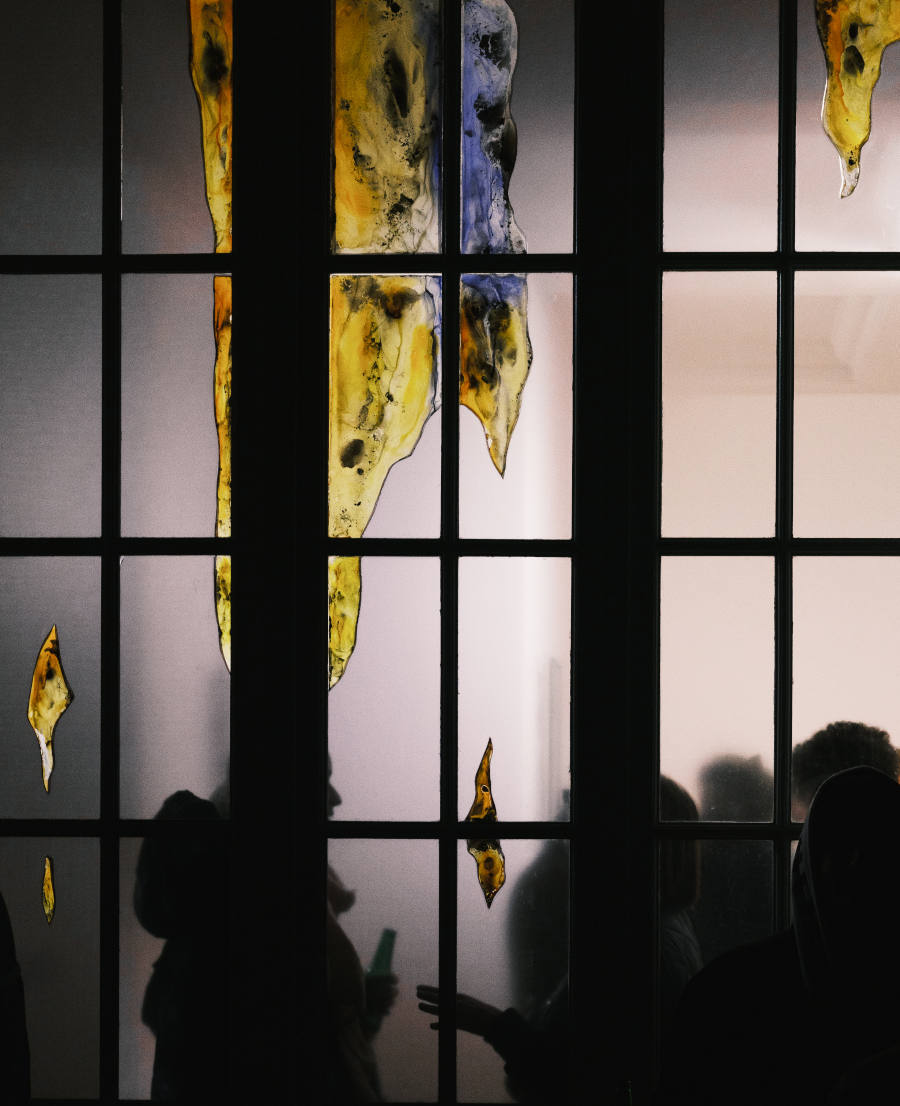 L’exposition de Marion Flament commence dès la cour du Marais parisien dans laquelle se cache la galerie Romero Paprocki. Les verrières recouvertes de vitrophanies laissant à peine deviner ce qui se trame à l’intérieur préfigurent des thèmes du travail de l’artiste tels que la lumière, le vitrail ou la transparence. En cette période hivernale où la lumière se fait rare, cela nous donne la possibilité d’approcher l’exposition de deux façons : de jour, l’intérieur occulté, ou de nuit, une lumière chaude nous appelant à entrer.