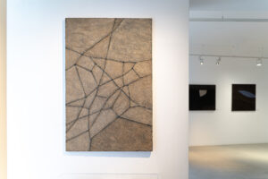 À la fin des années 1970, un autre langage affleure. Les séries Réseau 11 (1979), Harpe éolienne (1979) ou Écriture série réseau XI (1980) introduisent la ligne, la ficelle, l’incision. La surface se met à parler autrement. Des réseaux s’y déploient, évoquant à la fois des cartographies et des écritures primitives. La peinture de Monette Guermont devient un espace de circulation. On ne sait plus s’il s’agit d’un sol vu d’en haut, d’un fragment de mur, ou d’une page gravée par le temps.