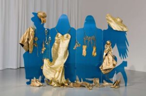 On retrouvera dans le parcours Fat to Ashes (2021), structure monumentale du Hamburger Bahnhof, édifice de tissu aux drapés roses et rouges où le spectateur pénétrait pour découvrir une projection hallucinée. Il Paravento (2024), jonché de silhouettes bleues couronnées d’or a été réalisé en collaboration avec la Feel Good Cooperative, collectif créatif-activiste composé de travailleuses de l’art et du sexe cofondé à Rome pendant la pandémie. Hot Flashes Flowers (2023), montré pour la première fois au au Centraal Museum d’Utrecht, est un jardin de roses surdimensionnées où le kitsch le dispute au rituel.