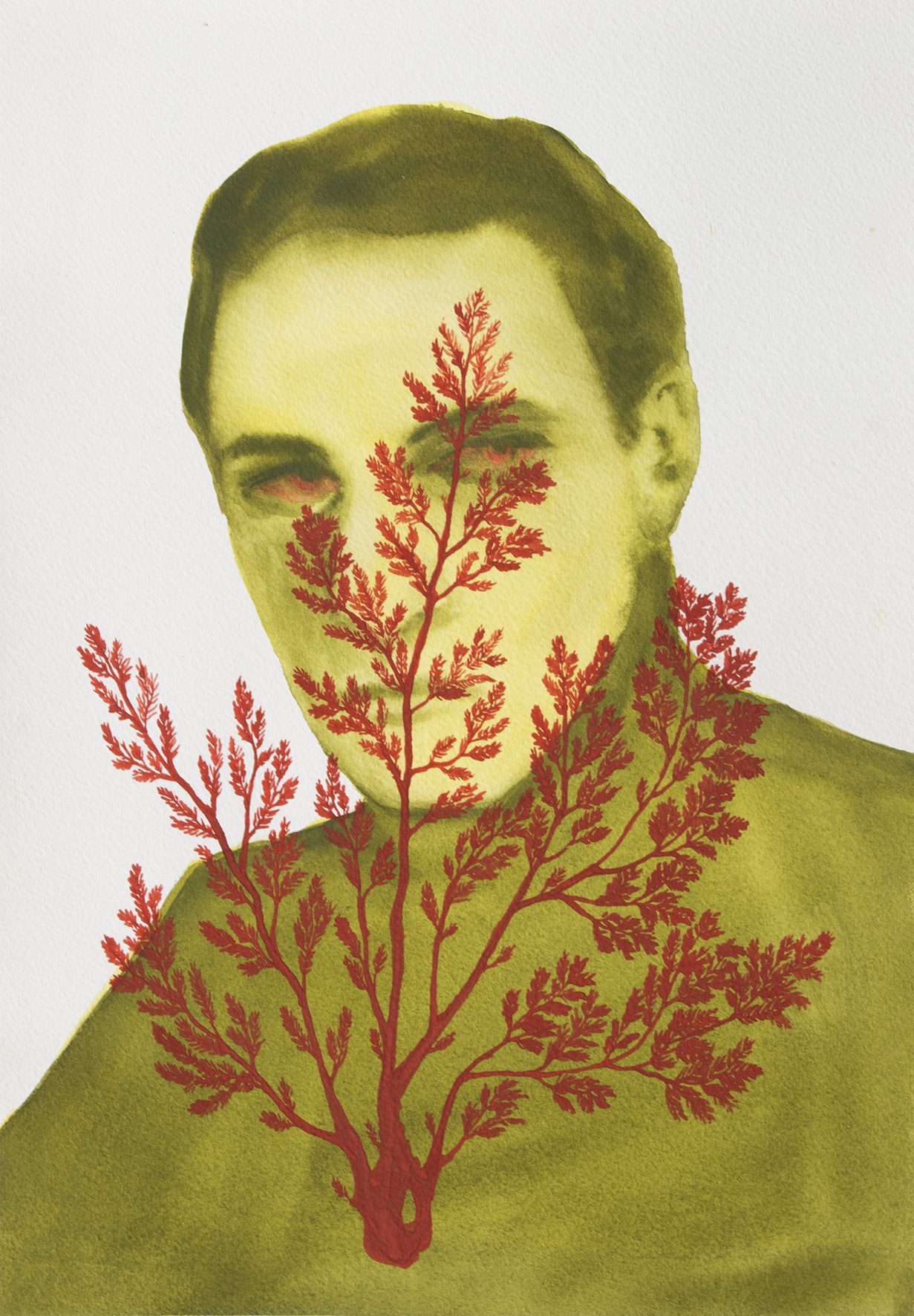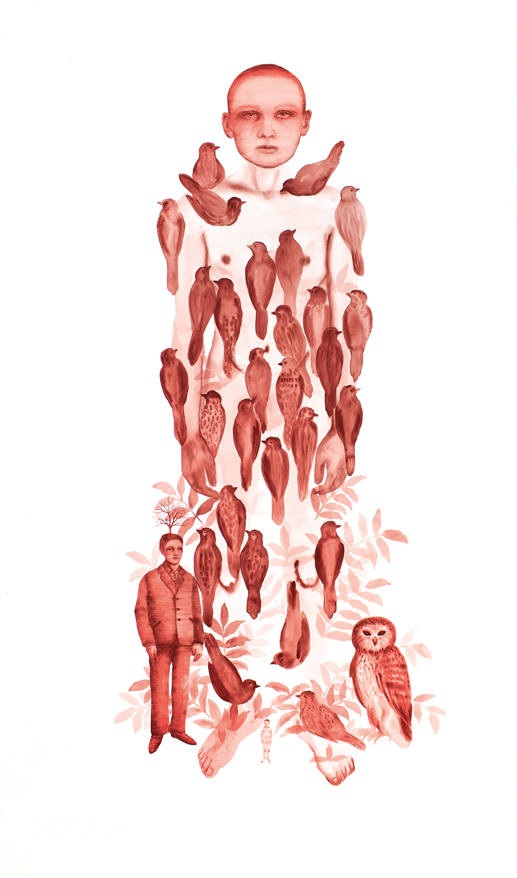 L’univers d’Odonchimeg Davaadorj fourmille d’humains, de plantes, d’oiseaux et d’êtres hybrides. Née en Mongolie et élevée dans un système de croyance animiste, son œuvre retranscrit une vision du monde sans hiérarchie au sein du Vivant, porté par la Terre-Mère. Ses aquarelles associent animal et végétal en superpositions ou en hybridations, une liane entourant des corps, des jambes prenant racine dans le papier, ou des plantes poussant du haut du crâne, comme une antenne sensible sur le monde. Les humains sont nus, sans artifices, au même titre que les végétaux et les oiseaux. Chaque être est au même niveau, et les vies se croisent, se lient, s’entremêlent.