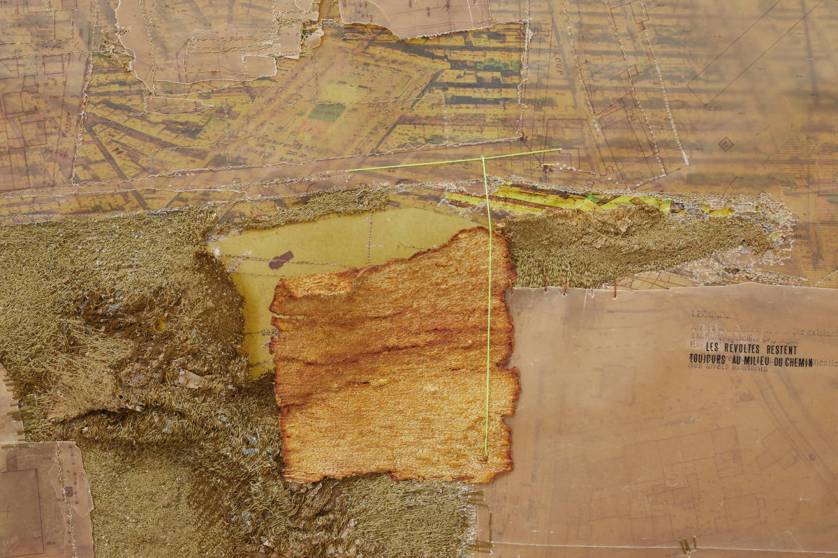 1- Cathryn Boch, Sans titre, 2019 – Détail – Plan urbanistique plastifié, carte topographique, photographies aériennes Mathieu Collin, vues aériennes colorisées, impression plastique, calque jaune, couture machine, couture main. Citation Jacques Ranciere – 113 x 282 cm © Cathryn Boch, 2024 – Photo : Jean-Christophe Lett