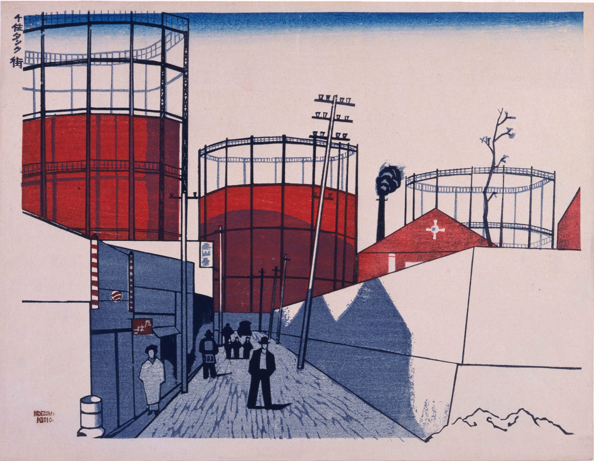 1- Cent vues du Grand Tokyo à l’ère Shôwa : Les gazomètres de Senju, Koizumi Kishio, 1930, gravure sur bois, 28 x 36,9 cm