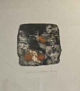 Une foule joyeuse s’est pressée autour de ses œuvres. Une large partie des amis du couple, dont quelques têtes très connues, des gens du village et quelques badauds, se sont sustentés à la beauté, à la poésie des œuvres disposées sur les murs blancs de la salle de la Fontaine aux pélerins. Un grand intérêt et un enthousiasme qui se sont traduits par l’achat de la quasi-totalité des gravures exposées, dont les droits iront à une fondation de méditation Terrânanda qui a aidé cette artiste durant son cancer. On retrouve ici non pas des manifestations de la maladie dans son travail mais les diverses orientations que son parcours de vie lui a fait prendre. Découvrant par exemple près de chez elle un graveur Monsieur Robert, imprimeur en taille-douce à Saint-Prix qui lui a enseigné ce qui fut son dernier et principal support artistique. Ou l’existence de ses grands tableaux aux tons lumineux de douceur, empreints d’une tendresse pour les plantes qui étaient sa passion, qu’elle dispensait autour d’elle.