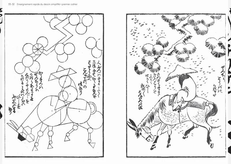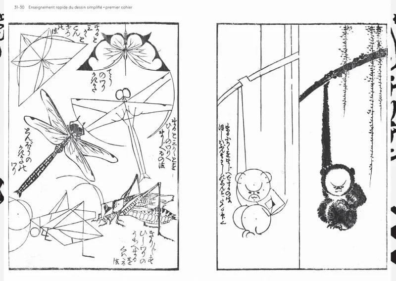 Au Japon, traditionnellement, l’apprentissage d’un savoir-faire, que ce soit cuisiner, fabriquer une lame, teindre un tissu ou modeler une céramique, se fait par mimétisme de l’élève sur le maître. Avant de commencer à créer quoi que ce soit, l’élève se doit d’observer les gestes et d’écouter les préceptes de son maître, de maîtriser l’utilisation et l’entretien de ses outils et ce jusqu’à ce que cela devienne une seconde nature. En dessin, cela se faisait donc en recopiant les dessins à l’encre sur papier que fournissait son maître, en les étudiant, les décomposant et en les restituant d’un coup de pinceau assuré. Tout ceci, Hokusai l’enseigne dans ces pages, s’adressant à tout le monde, quel que soit le niveau.