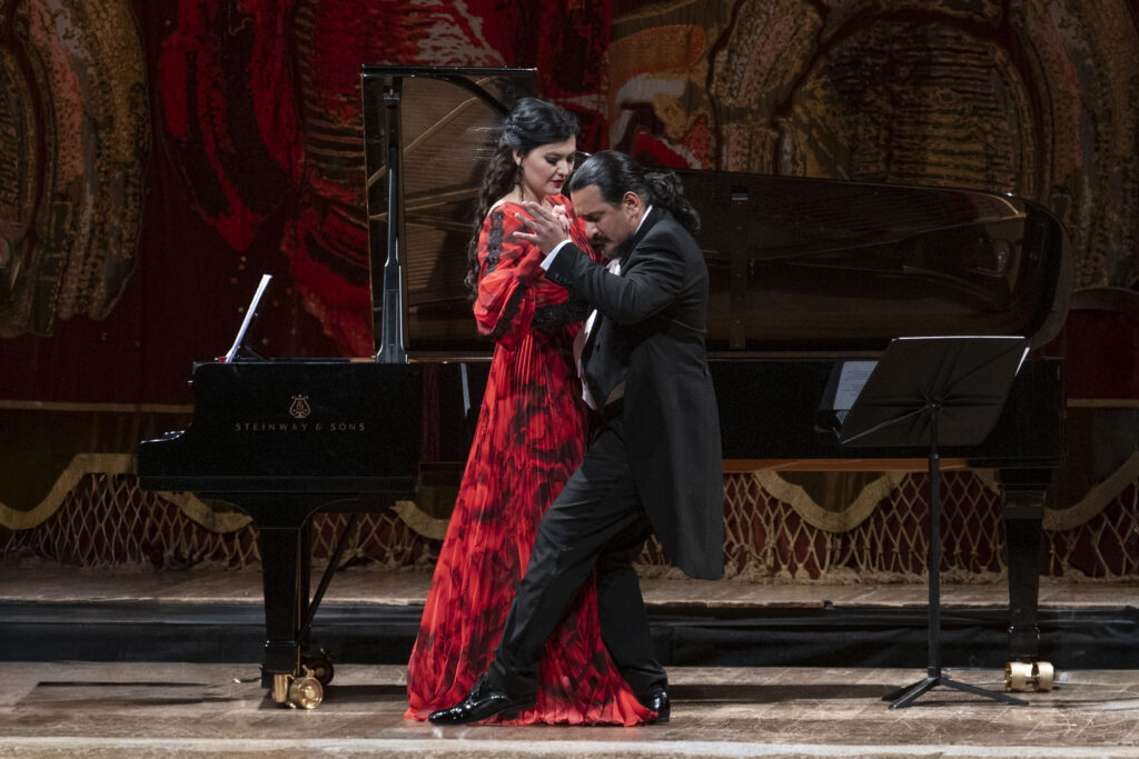 Pour clore le récital, la mezzo a réservé son hommage musical à l’Argentine en abordant trois pièces de compositeurs du Río de la Plata : « La rosa y el sauce », une charmante chanson de chambre de Carlos Guastavino, et deux tangos cultes « Por una cabeza » (dont le texte semble décalé pour une voix féminine) et « El día que me quieras », composés par Carlos Gardel sur des textes d’Alfredo Le Pera. Ces tangos sont venus assortis ce soir de nouvelles « surprises » qui ont contribué à recréer l’atmosphère du 2/4 (rythme binaire du tango). Tout d’abord, Jonathan Papp a laissé la place à un trio de guitares gardéliennes de très haut niveau qui ont accompagné la chanteuse russe dont la couleur vocale et le phrasé s’accordent étonnamment au genre tanguero. Puis, Germán Alcántara est revenu sur scène pour chanter et danser avec elle « El día que me quieras ». Inutile de dire que, à ce stade, le public était en délire !