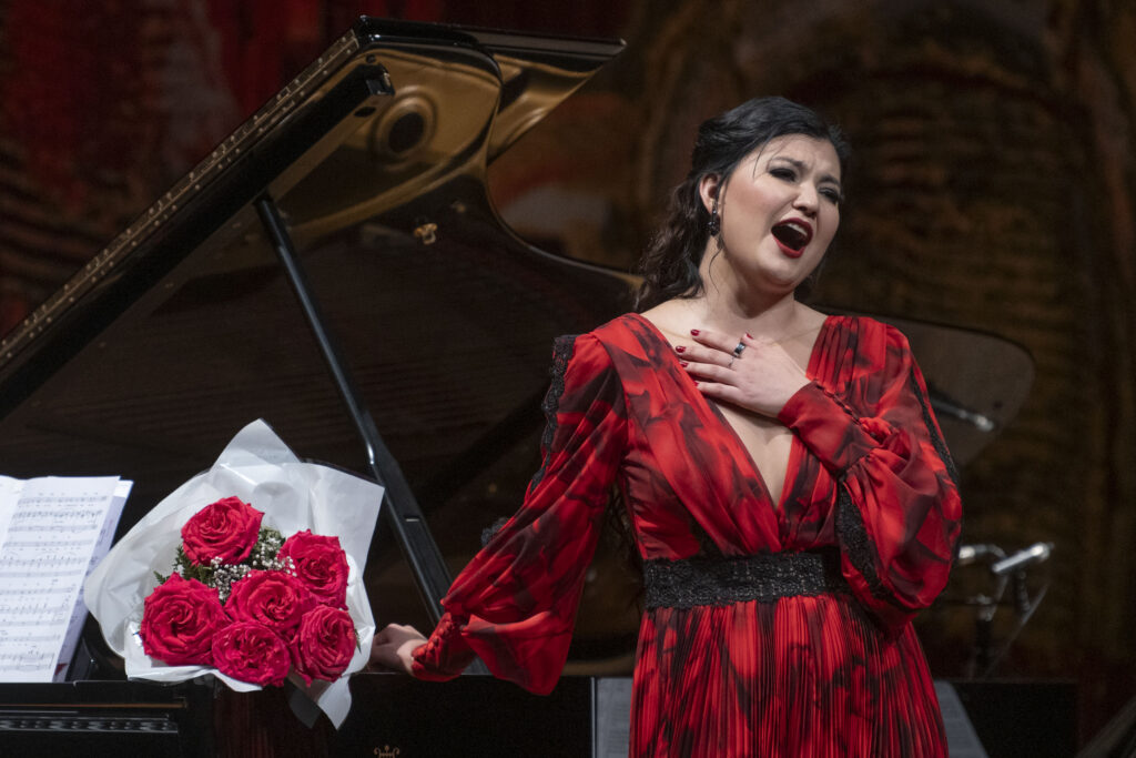 Comme il allait de soi, pour finir ce premier volet de son récital, elle a choisi deux airs de Carmen de Georges Bizet, l’opéra qui l’a fait connaître. Découverte en 2015 par David Gowland, directeur artistique du Programme Jette Parker pour jeunes artistes du Royal Opera House de Londres, dans un concours à Moscou (où elle a raté l’aigu de « Una voce poco fa »), elle a intégré pendant deux ans ce projet de perfectionnement qui lui a permis, à 21 ans, de faire ses débuts dans le rôle-titre de Carmen. Elle l’a interprété depuis, dans les espaces lyriques les plus prestigieux du monde, dont le MET de New York, les Arènes de Vérone ou l’Opéra de Vienne. Pour terminer cette première partie de la soirée, elle a donc inclus « L’amour est un oiseau rebelle » et la « Séguedille », des airs qui lui sont bien familiers. Et pourtant – fatigue, détente ou au contraire trop de tension – la célèbre « Habanera » n’a pas compté parmi les pièces les plus réussies du récital.