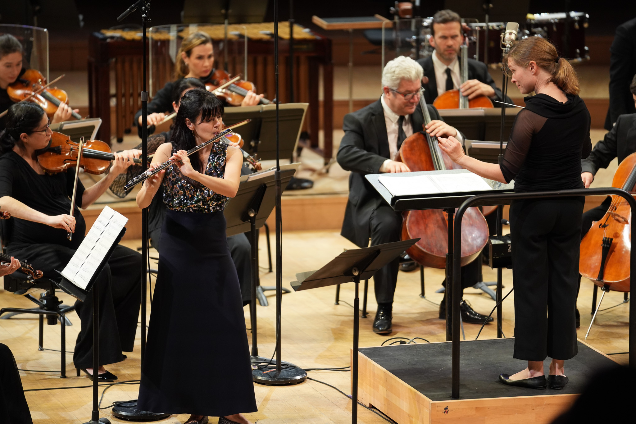 Le mouvement final, Allegro comodo, est imprégné de souvenirs plus joyeux d’avant-guerre ; des motifs klezmer que le père de Weinberg jouait dans les théâtres juifs de Varsovie. La séquence d’harmonies riches s’achève sur un finale virtuose que Mathilde Calderini exécute avec brio. Mirga Grazinyté-Tyla, qui a enregistré le Concerto pour flûte de Weinberg avec Deutsche Grammophon en 2022, dirige le Philharmonique et la soliste avec une douceur ferme et le résultat en est une interprétation tout en filigrane ; précise, subtile et fluide.
