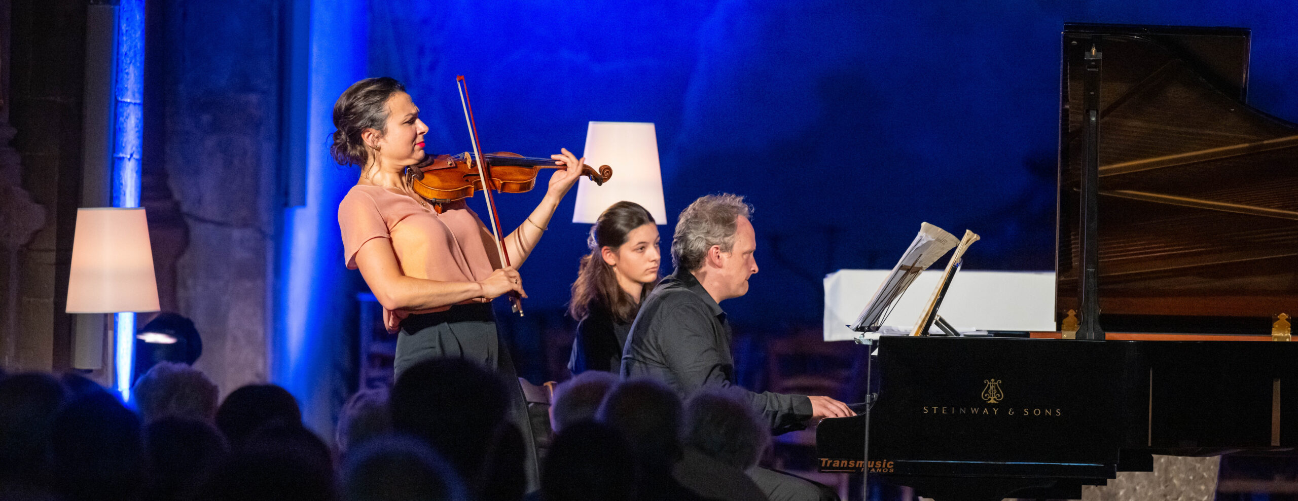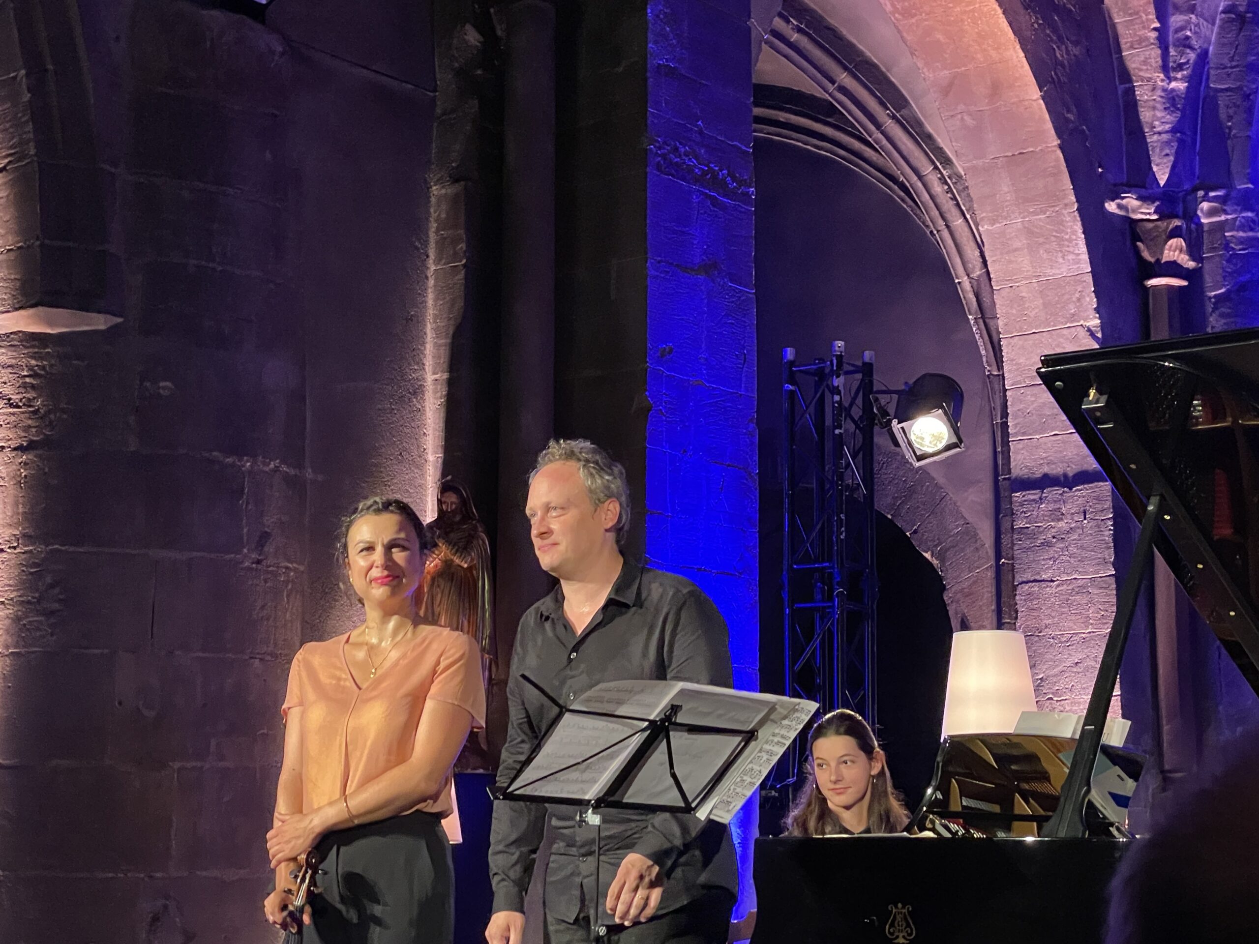 À 17h, dans la jolie lumière bleue et la chaleur romane de l’église Saint-André, la violoniste Sarah Nemtanu et le pianiste Romain Descharmes proposaient de nous immerger dans le programme de leur dernier album. Ce dernier éclaire par plusieurs facettes l’œuvre de George Enescu, Impressions d’enfance (alpha music). Il s’agit d’une suite de dix tableaux pour piano et violon qui s’est donnée en 1942 à Bucarest et qui est dédiée au premier professeur de violon du compositeur.