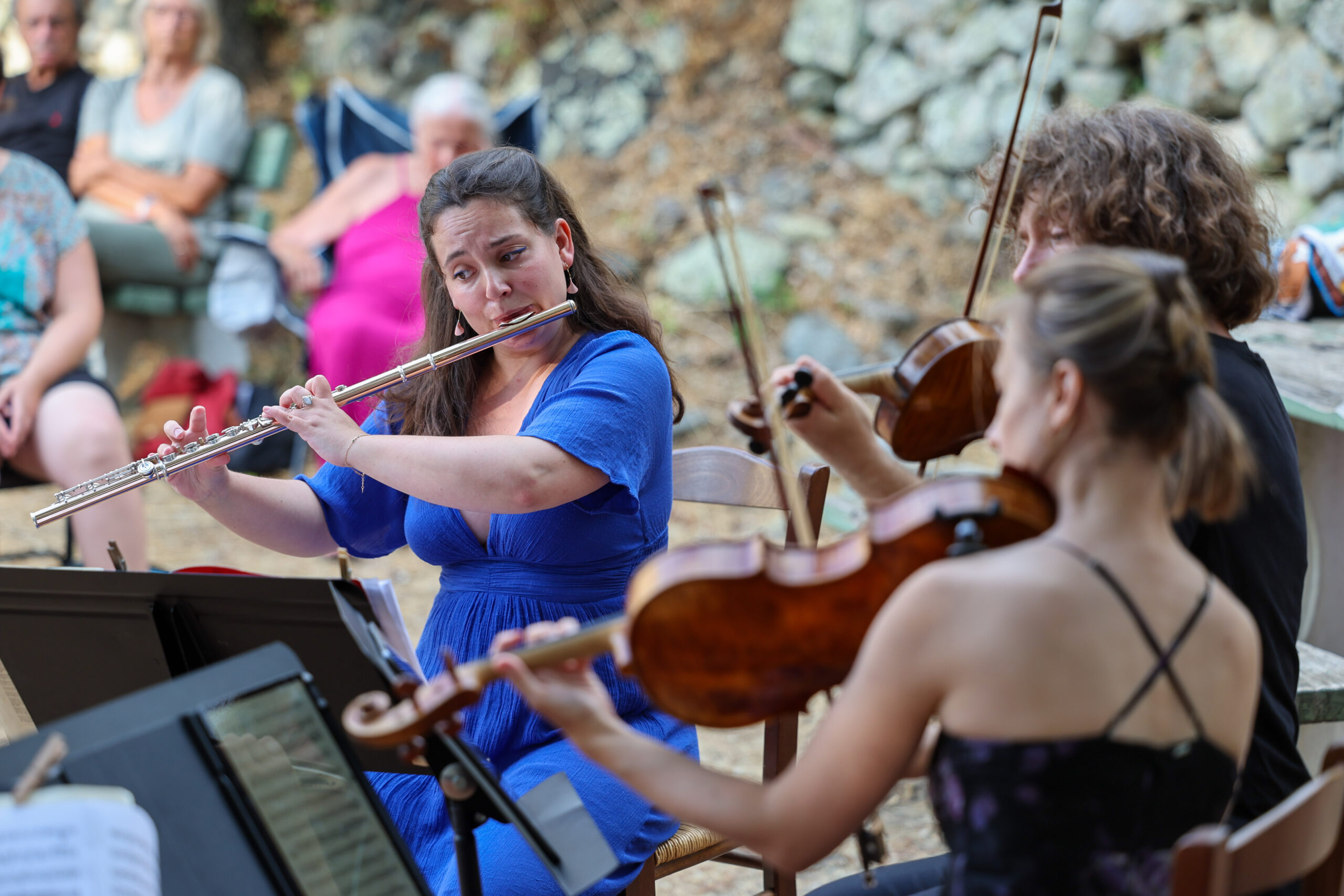 En plein air, comme dans un roman de Goethe, au son de cloches et des coassements des milans, c’est devant la chapelle Saint-François de Zilia que la flûtiste Eve-Nina Kodmus a ouvert la soirée avec une énergie rayonnante. A ses côtés, trois autre artistes en résidence aux Rencontres, qui se prêtent habilement au jeu exigeant de constituer ad hoc un quatuor. Le programme, allant de Vienne à Berlin, mettait à l’honneur le répertoire allemand du XVIIIe siècle pour flûte, avec des œuvres de jeunesse. Dès les premières mesures d’un Haydn élégant, la musicienne brille, soutenue par Guillaume Latour (ex-Diotima) au violon et Adèle Ginster à l’alto, particulièrement remarquables dans le deuxième mouvement où ils se relaient pour assurer les lignes de basse.