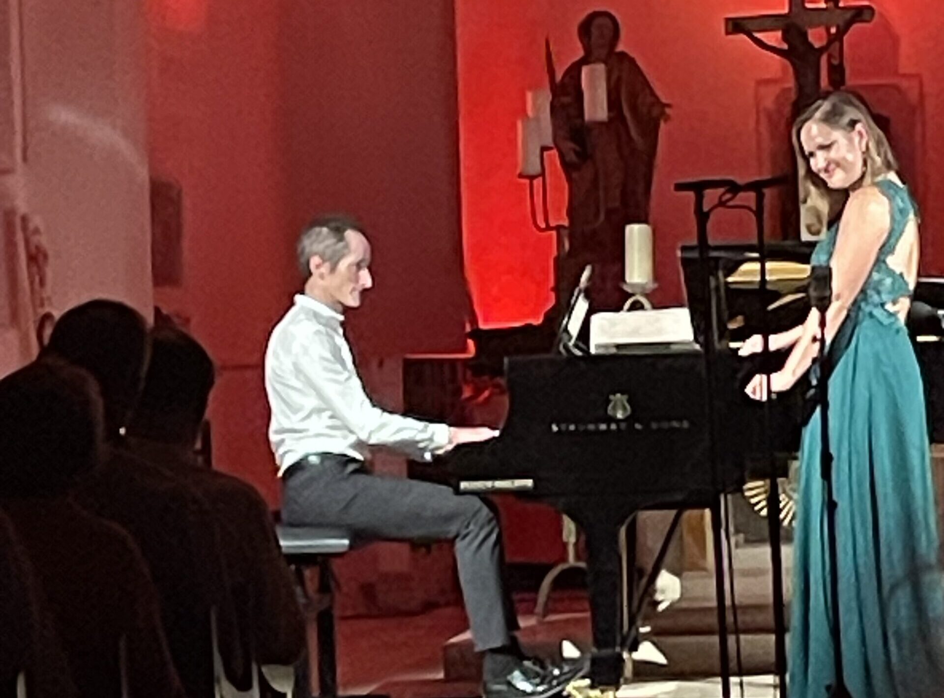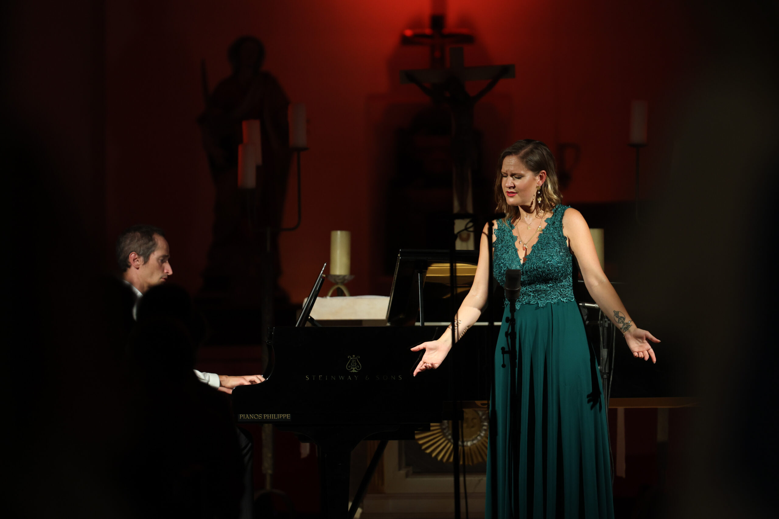À 21h30, craignant l’orage ou privilégiant l’acoustique des murs épais, ce n’est pas dans les jardins mais bien dans la chapelle Sainte-Restitude que la mezzo-soprano corse Eléonore Pancrazi et le pianiste Antoine Allérini donnaient rendez-vous. Alors que la nuit s’épaissit et que la chaleur plane sur les lumières bleutées de la chapelle la chanteuse qui a dédié son premier album à des airs populaires Corse, fait le lien entre l’île de Beauté et Séville. Un lien qu’elle inaugure par le fameux Barbier, avec la cavatine de Rosine qui est tout sauf «naïve», nous dit la chanteuse. Le «génie populaire» nous fait zigzaguer entre bel canto et chants populaires corses. Mais il met aussi et surtout en avant les femmes méditerranéennes– grands-mères ou amoureuses au très fort tempérament- incarnées par la mezzo-soprano corse. Cette dernière nous fait vibrer en robe verte, dos nu, avec un carré années 1920, une bouche vermillon et un charisme débordant. Elle nous impressionne par son timbre puissant, son intensité dramatique et sa maîtrise. C’est d’ailleurs elle qui introduit tous les morceaux, y compris les solos d’Allérini : une Mazurka de Chopin et les Jeux d’eau de Ravel. En cette année d’anniversaire Ravel, elle nous offre trois mélodies corses qui font partie des premiers arrangements du compositeur. Les partitions dormaient au musée de la Corse, à Corté, depuis une trentaine d’années. La beauté du Lamento d’Orezza nous transperce. Et Pancrazi nous explique que les chants qui accompagnent les disparus de mort violente sont différents des autres, ce faisant, elle regrette la vendetta et son chant tragique prend des allures de plainte viscérale.