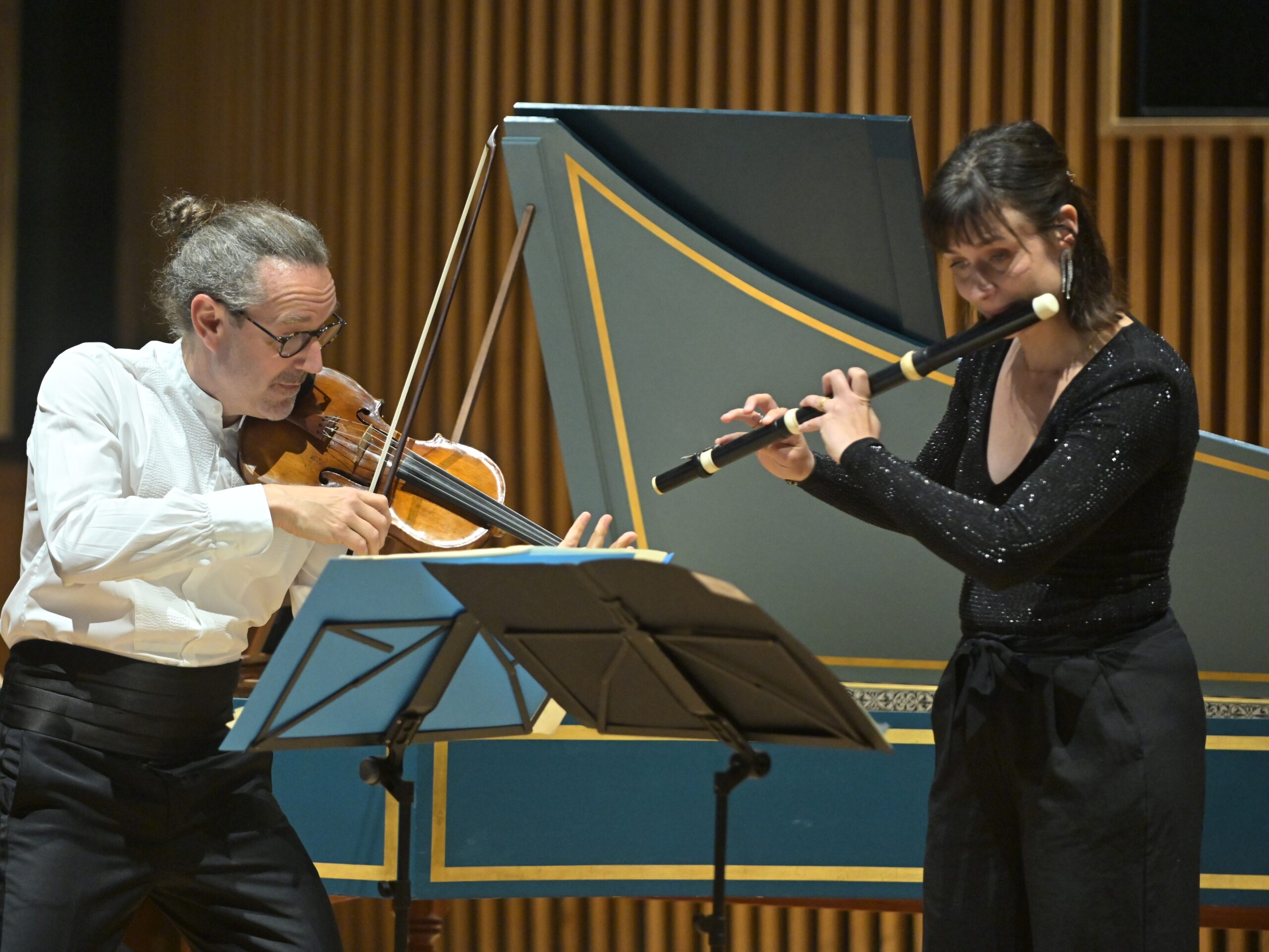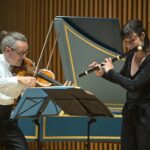 C’est avec la vivacité qui le caractérise et depuis son violon que Julien Chauvin a dirigé et interprété le 5e Concerto Brandebourgeois de Jean-Sébastien Bach. Devant le clavecin de Sibylle Roth qui a ouvert le premier mouvement, c’est en duo (et presque en tête-à-tête) avec la flûtiste Anna Besson que son violon nous emmène dans un dialogue si expressif que l’on a l’impression que les deux solistes dansent l’un vers l’autre. Le clavecin joue d’abord le rôle de basse continue avant de s’immiscer dans le dialogue, relayé pour la basse par le violoncelle. L’interprétation est vive et très délicate. À la fin de ce premier mouvement Allegro, c’est un nouveau morceau de bravoure du clavecin. Puis vient le deuxième mouvement, Affettuoso — ce lamento est bref —, et c’est dans un même élan que l’on bascule vers l’Allegro final, une gigue populaire pleine de grâce. Julien Chauvin rejoint le pupitre des violons pour laisser la place aux deux instruments stars du Concerto TWV 52 de Telemann : la flûte traversière et la flûte à bec, traditionnellement mises en compétition et qui, dans cette œuvre, se répondent avec grâce et complicité. L’ensemble des sept musiciens entame le premier mouvement, d’une tenue presque solennelle. Lorsque le dialogue entre les flûtes s’installe, cela confère à la musique une dimension spirituelle. Le deuxième mouvement Allegro nous emporte dans une matière chatoyante, avec un magnifique solo de traversière auquel répond, évidemment, le solo de flûte à bec. Les pizzicati du troisième mouvement suspendent quelque peu le temps, avant que le quatrième et dernier mouvement ne nous emmène dans un temps suspendu que les contretemps et les tenues des violons soulignent, pour créer le contraste avec le finale, véritable bourdonnement à danser, faisant écho au dernier mouvement du Concerto Brandebourgeois de Bach, que les musiciens interprètent de manière virevoltante. Comme l’orchestre ne pourra pas bisser le Stabat Mater de Pergolèse prévu en deuxième partie — qui forme un tout —, Julien Chauvin propose de reprendre en bis, avant l’entracte, ce Presto endiablé qui balaie d’un trait toute image compassée de Telemann.