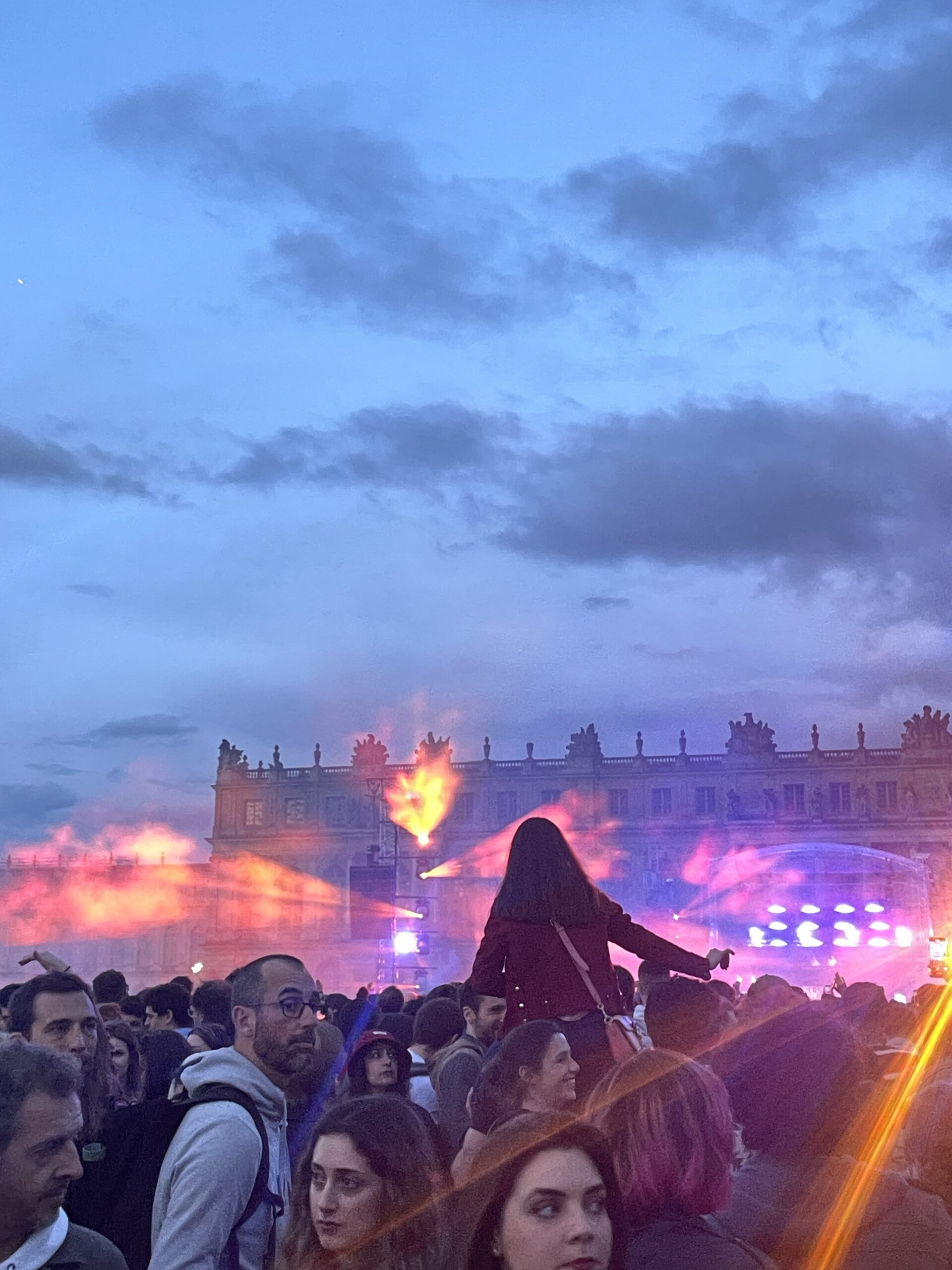 Dès l’entrée, qui s’effectue par le château l’effet est bluffant : passer sur les pavés, regarder la chapelle royale subtilement illuminée dans le soleil déclinant et entrer de manière suave dans l’espace dédié au DJ set est une promenade qui nous relie avec le 17e siècle. Surtout avec un ciel pommelé et une pluie qui vient de s’arrêter. Alors que plusieurs espaces sont organisés avec différents tarifs donnant droit à différents types d’accès et de boissons, il n’y a plus de vente de billets sur place, ils ont tous été écoulés. Les DJ set se sont glissés dans l’univers des grandes eaux, entre la façade du château éclairée par un VJing d’enfer et le bassin d’Apollon. Derrière le public s’ouvre «La Grande perspective». La majorité des danseurs est plutôt jeune et semble avoir grandi avec la «French touch», ce fameux son à la Française né dans le 92, non loin du 78 et qui continue depuis les Daft Punk à rayonner dans le monde entier. Quoi de plus naturel pour cette 4e édition du Festival que Château de Versailles Spectacles mette en avant les fleurons de ce courant musical qui dessine une certaine image de la France dans le monde entier ? L’occasion de découvrir une DJ belge montant qui s’inspire de la French touch et internationalise, Nathalie Duchêne, mais aussi, de prendre le vent et l’énergie du mix chic de Radio cargo.