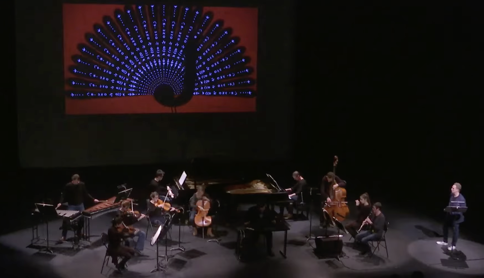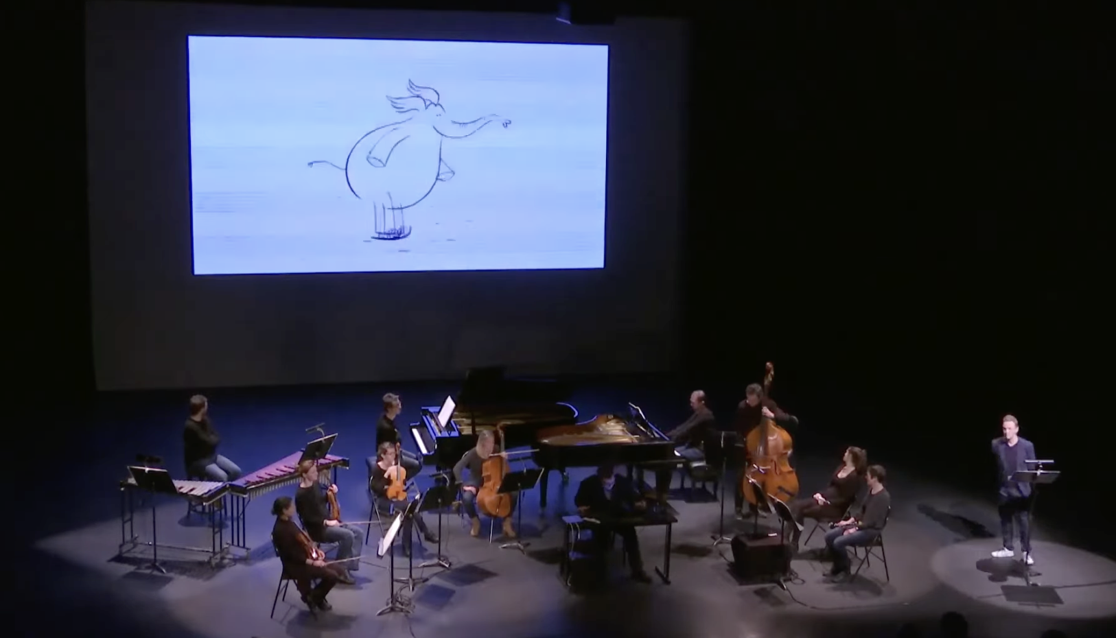 Le Carnaval des Animaux, cette suite « pas sérieuse » composée pour rire par un monsieur sérieux (Camille Saint Saëns) est jouée par une petite formation musicale de chambre, qui comprend le prestigieux violoncelliste Gauthier Capuçon, auquel sera réservé l’une des plus belles illustrations musicales de ce Carnaval, celle du Cygne, moment émouvant où chacun retient son souffle devant tant de beauté et de virtuosité. Quelques membres de sa Fondation complètent cet orchestre de chambre (piano, xylophone, violons, altos), composé également d’une contrebasse, d’une flûte, d’une clarinette et de percussions.