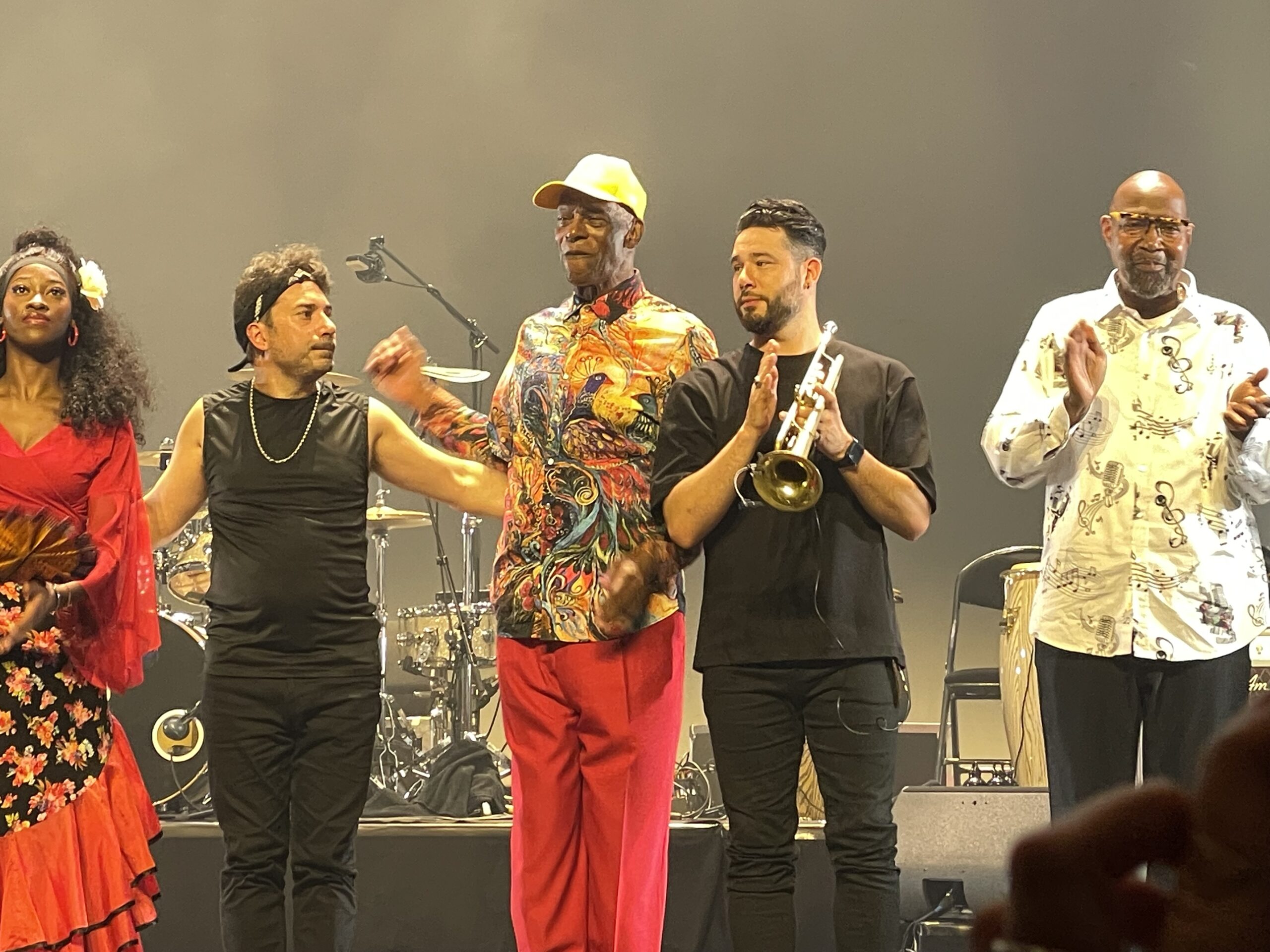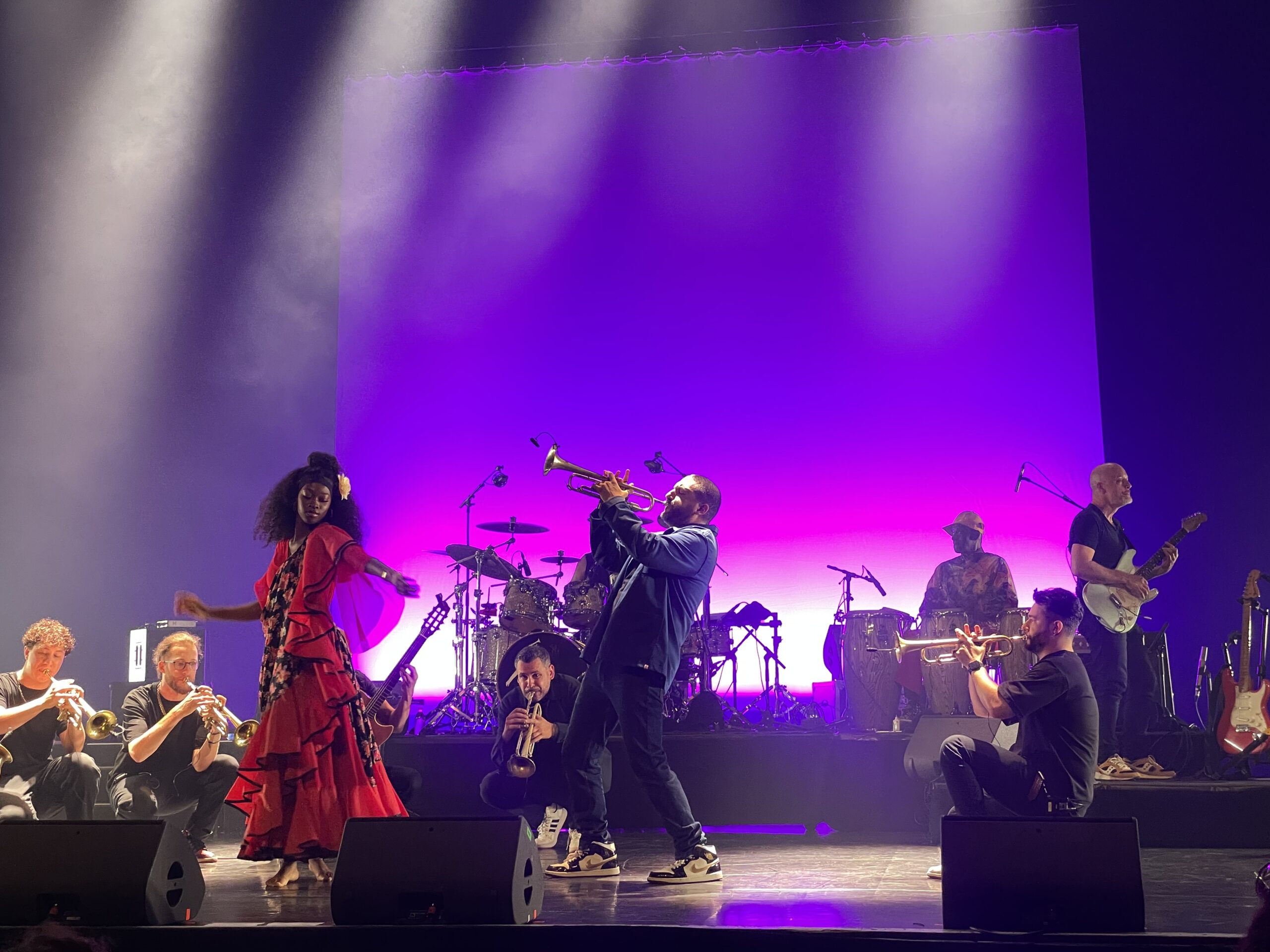 Lorsque Ibrahim Maalouf et son chœur de trompettes entrent en scène, la nuit vient de tomber et la lumière se fait chaude. On a besoin de faire la fête, surtout en ce moment, répète plusieurs fois le musicien qui se réjouit de ce moment de joie et de partage que sont les JO. Il blague, beaucoup. Et il demande aussi à toutes et tous de chanter, en jouant les chefs de chœur. Avec deux guitaristes et bassistes, les Trompettes de Michel Ange jouent le programme de leur album qui sort en septembre (« Pour ne pas faire d’ombre aux JO »), qui commence par une demande en mariage et passe par le conseil des sages du village qu’on imagine déjà boire leur arak. C’est d’autant plus lumineux que les morceaux sont émaillés de danse – d’une danseuse en costumes colorés et du public qui est amené à beaucoup participer.