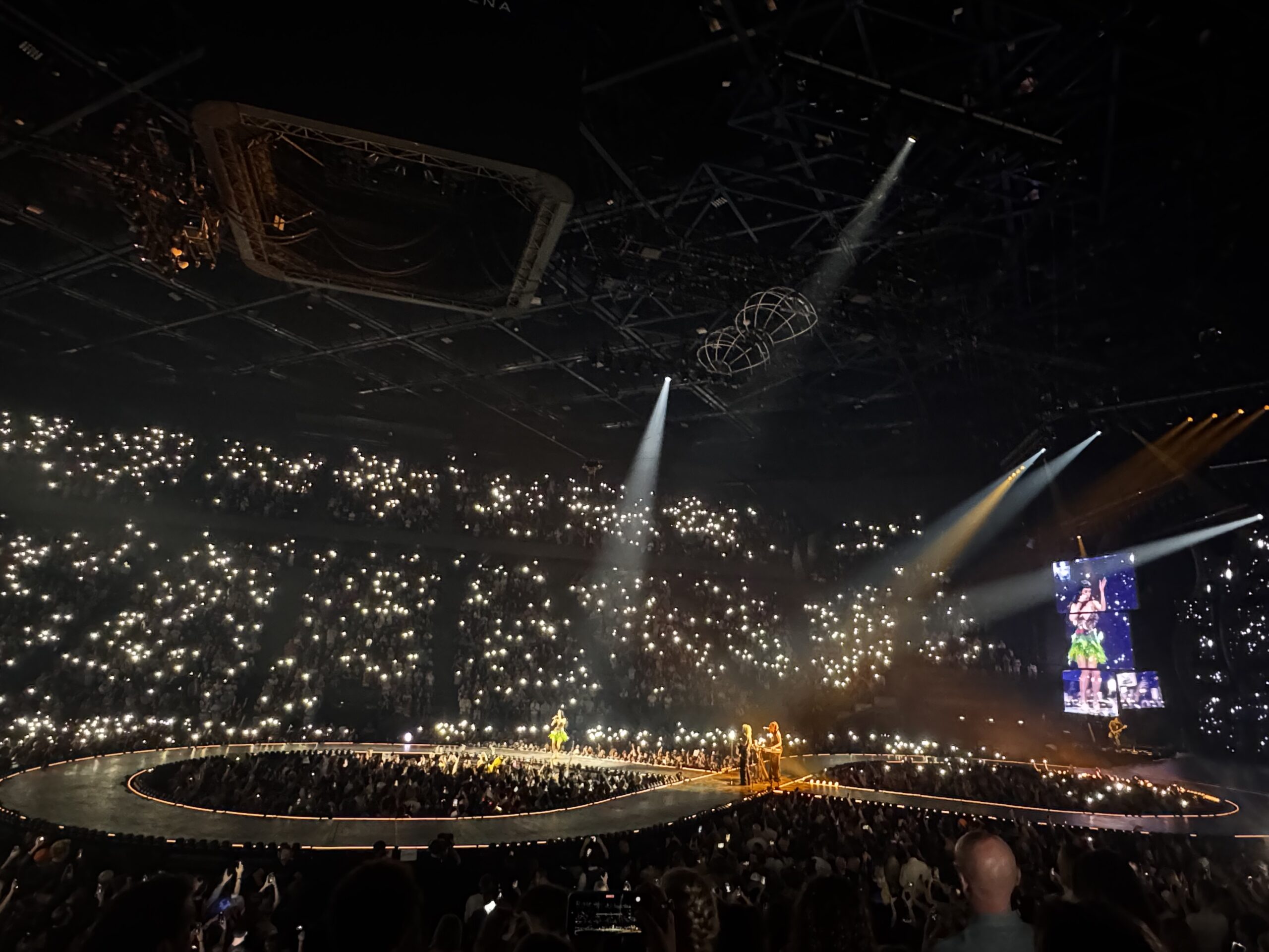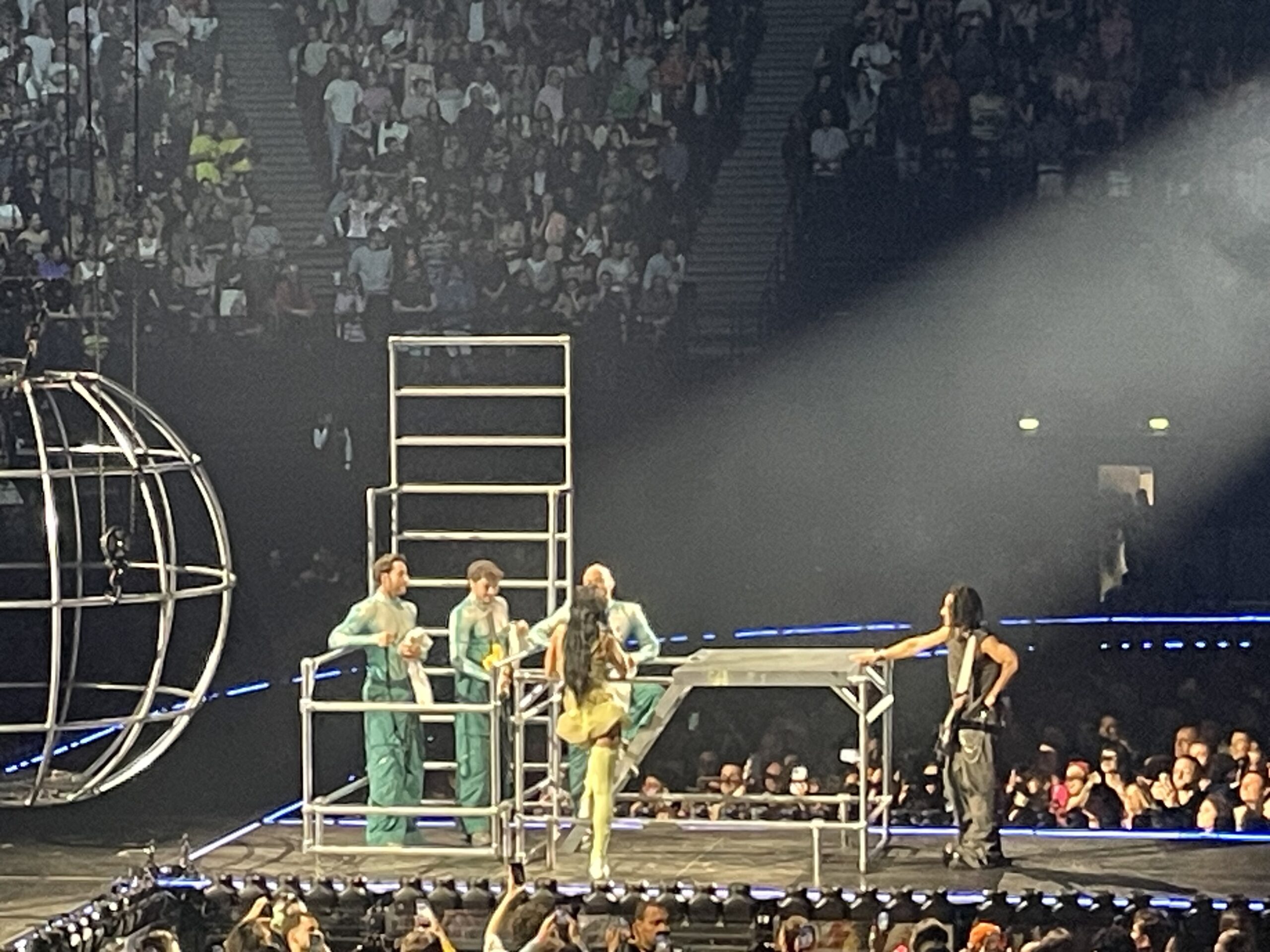 « Il y a les chats et les souris » annonce Katy Perry juste avant de dédier une séquence entière de son show à ceux qui l’adorent qui se sont déguisés, et de les les faire monter sur scène pour leur donner des accolades. Les « Kitty Cats » ce sont ses fans et Katy leur doit tout. Et ses fans français, après 8 ans d’absence, elle est bien heureuse de les retrouver aussi nombreux : 3 soirs complets avec les 3 et 4 novembre cela fait quand même 45 000 personnes ! Perry est une daronne de la pop. Elle leur offre même la possibilité de choisir deux chansons via une application, mais n’oublie pas d’être un peu capricieuse et choisit en fait la 2e. Car Katy Perry est une princesse un brin domina avec ses grandes cuissardes et ses tétons lampe rouge. Et les fans adorent ça ! Dans la salle, ils et elles ont tous les âges et les mères sont venues avec leurs filles. Katy, à peine passé la quarantaine, mais qui appartient encore au temps où l’on vendait des disques dont on déchirait le cellophane (143 millions tous types confondus !). Et ce n’est donc pas avec son nouvel amoureux, Justin Trudeau, mais avec ses fans, ses costumes de Barbarella et de nombreuses chansons dédiées à sa fille de 5 ans (dont le titre éponyme de la tournée) qu’elle a décidé de le passer.