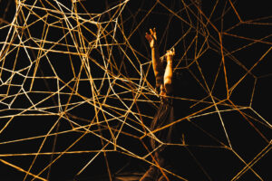 Anitya – L’impermanence se présente d’emblée comme une œuvre plastique, à contempler avant même sa mise en jeu. Au centre de l’espace scénique éclairé, entouré de quatre gradins, un cube aux arêtes métalliques et aux faces évidées accueille une proposition visuelle aussi élégante qu’intrigante. Des fils blancs s’entrecroisent dans tout le volume du polyèdre, se nouent les uns aux autres, forment un réseau complexe d’interdépendances, le moindre souffle qui dérange un fil faisant frissonner l’entièreté de la toile. C’est une dentelle qui rappelle celle de certaines araignées, ou un réseau de neurones, en même temps que c’est un objet à part entière, pas simplement métaphorique mais doué de sa propre beauté et de ses propres qualités mécaniques. Difficile de ne pas penser ici à l’artiste japonaise Chiharu Shiota. Si on lève le regard, dans l’immense espace vide du Cirque-Théâtre, le regard croise quelques objets bien ordinaires – livres, chaussures, vaisselle… – qui sont comme prisonniers des fils – à moins que ces derniers ne soient, simplement, ce qui les soutient ?