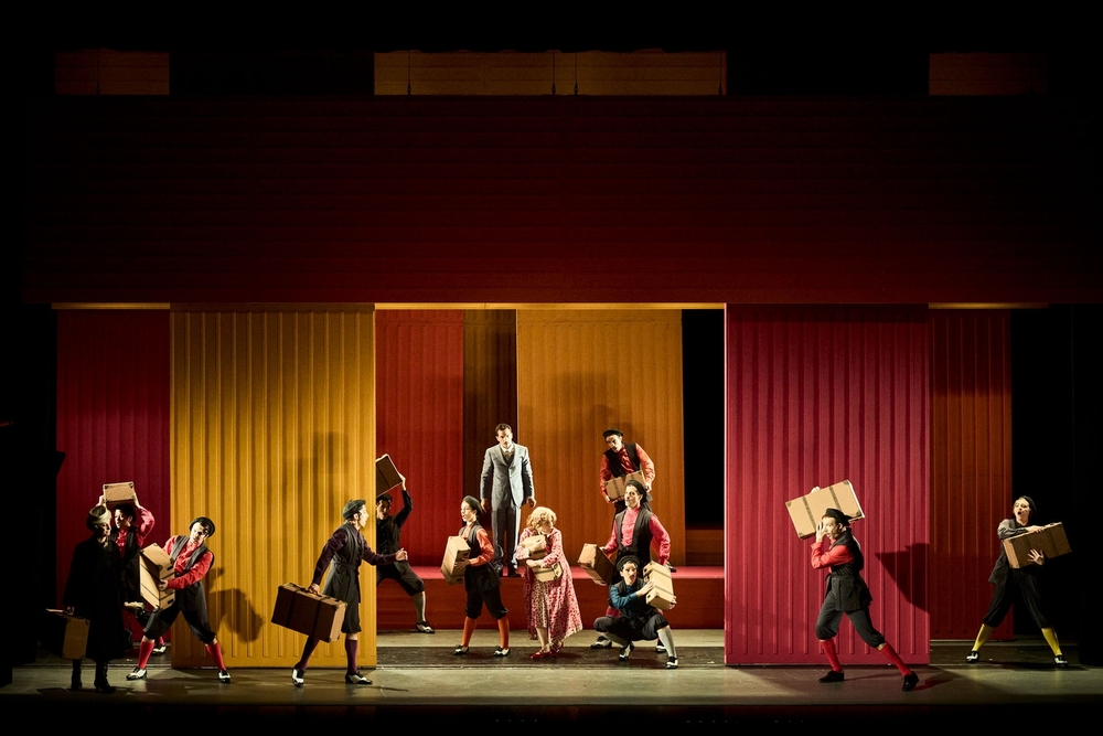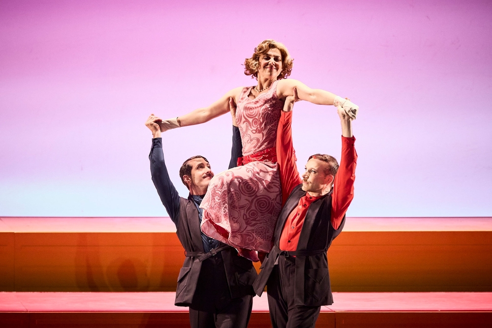 La mise en scène de Emily Wilson et Jos Houben valorise le mouvement sur scène à la manière des distractions hautes en couleurs dont Broadway raffolait entre les deux guerres. Il n’y a pas de temps mort, les comédiens/chanteurs entrent et sortent sans arrêt selon les situations, et la troupe de danseurs acrobates qui les accompagnent, amènent les quelques rares accessoires modulables et « jouent » avec des pièces de puzzle de formes géométriques, façon tangram chinois, qui symbolisent les états d’âmes des personnages.