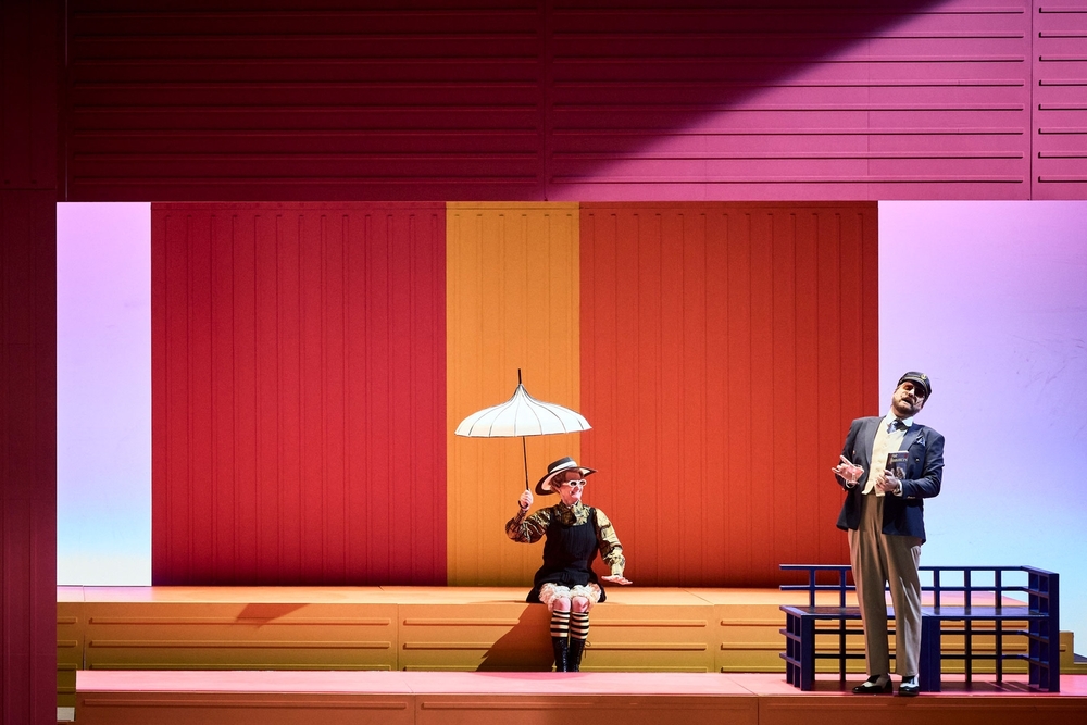 Des panneaux aux tons acidulés coulissent régulièrement pour marquer les entrées et sorties de personnages.