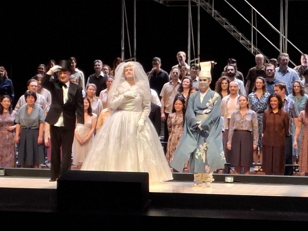 Ping, Pang et Pong sont à l’inverse en très grande forme et forment un trio irrésistible notamment à l’acte 2 qui leur est partiellement réservé. On y retrouve avec plaisir d’ailleurs, le ténor de caractère Thomas Cilluffo (Pong) qui incarnait si bien le bouffon dans « Der Schatzgräber » de Schreker deux jours auparavant. Un nom à retenir absolument dans ce style de rôle, où il se déchaine sur la scène (se travestissant même en mariée quand Calaf aide Turandot à revêtir la même robe), tout en chantant d’une très belle voix de ténor sans la moindre caricature. Il est très bien accompagné par l’élégant ténor léger Kangyoon Shine Lee (Pang) et le solide baryton Michael Bachtadze (Ping) que nous avions entendu la veille dans le rôle du peintre dans Violanta.