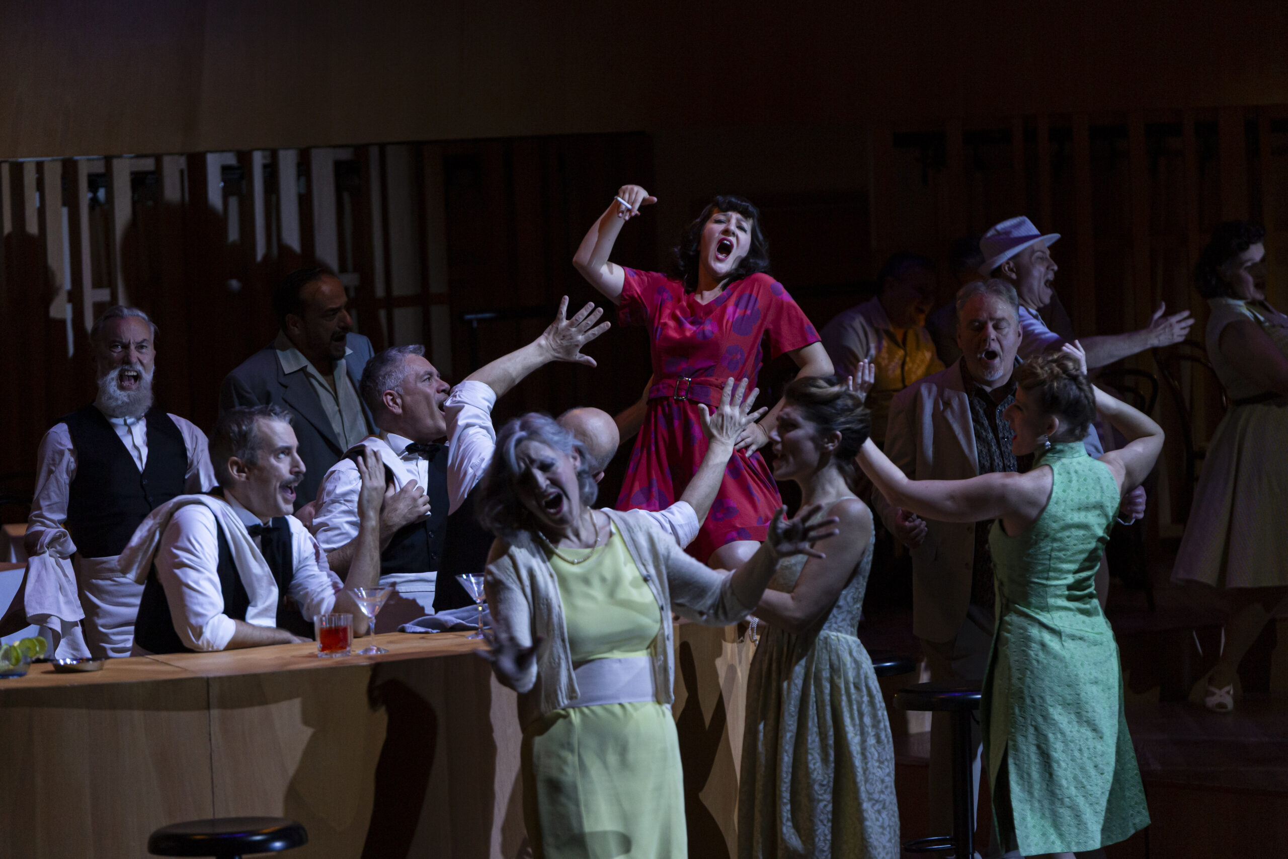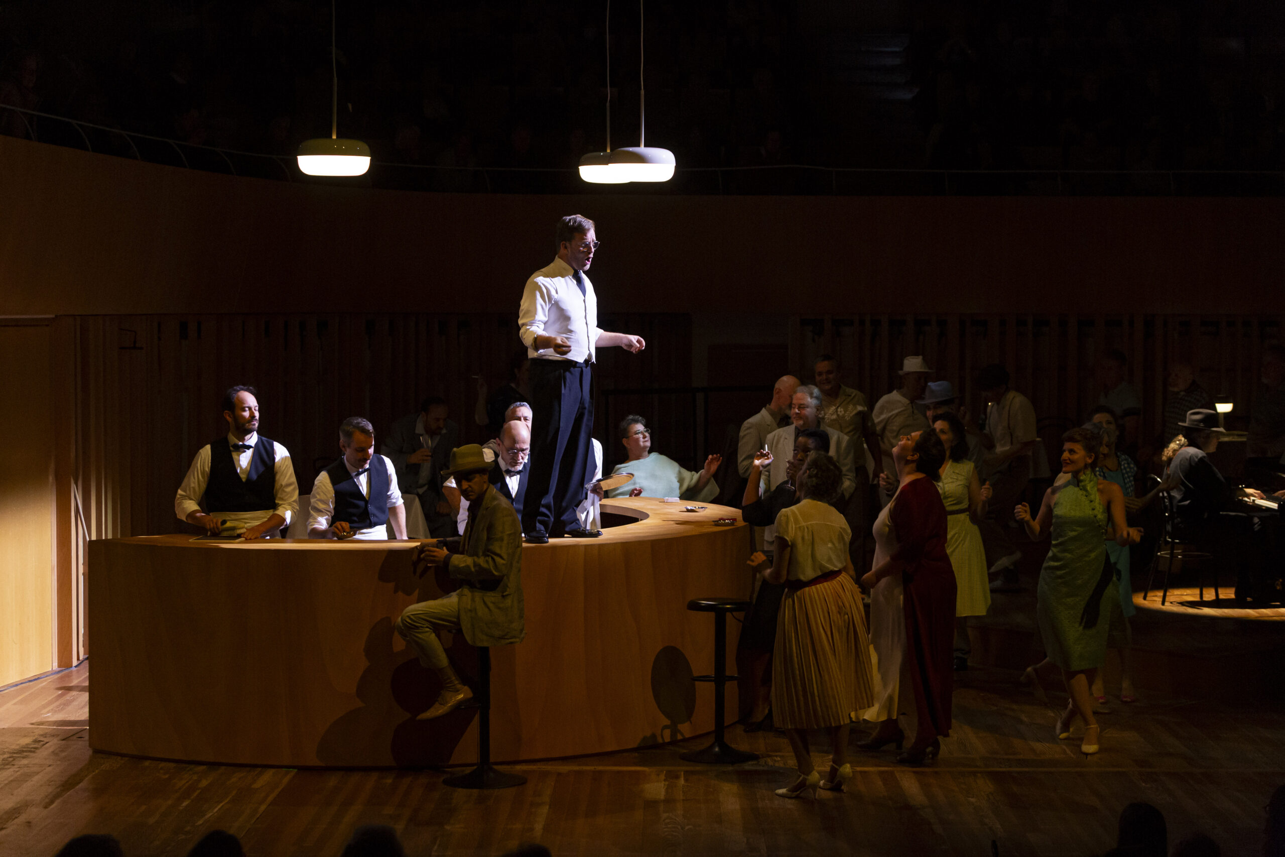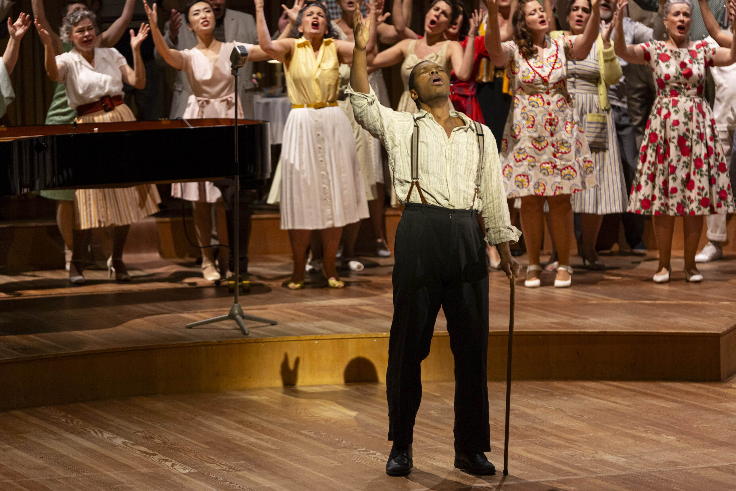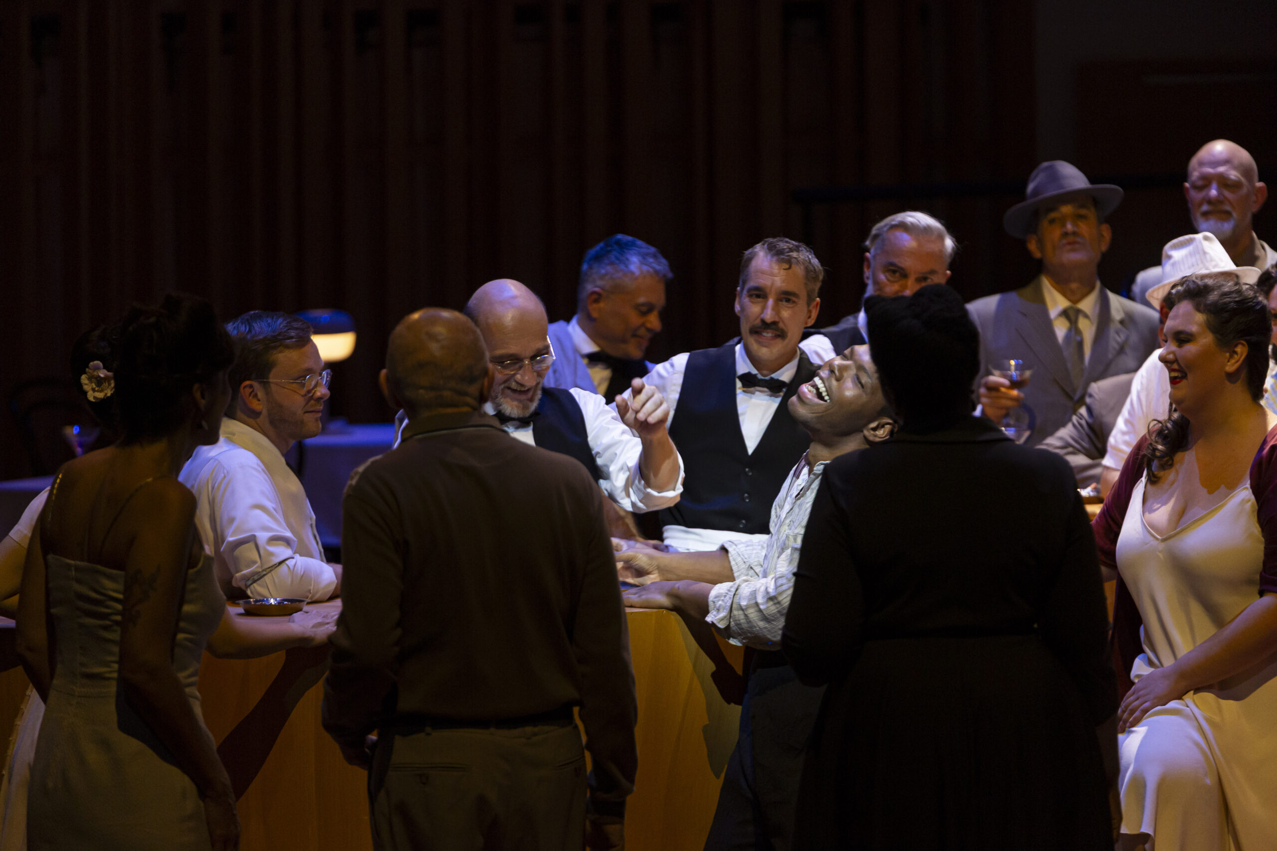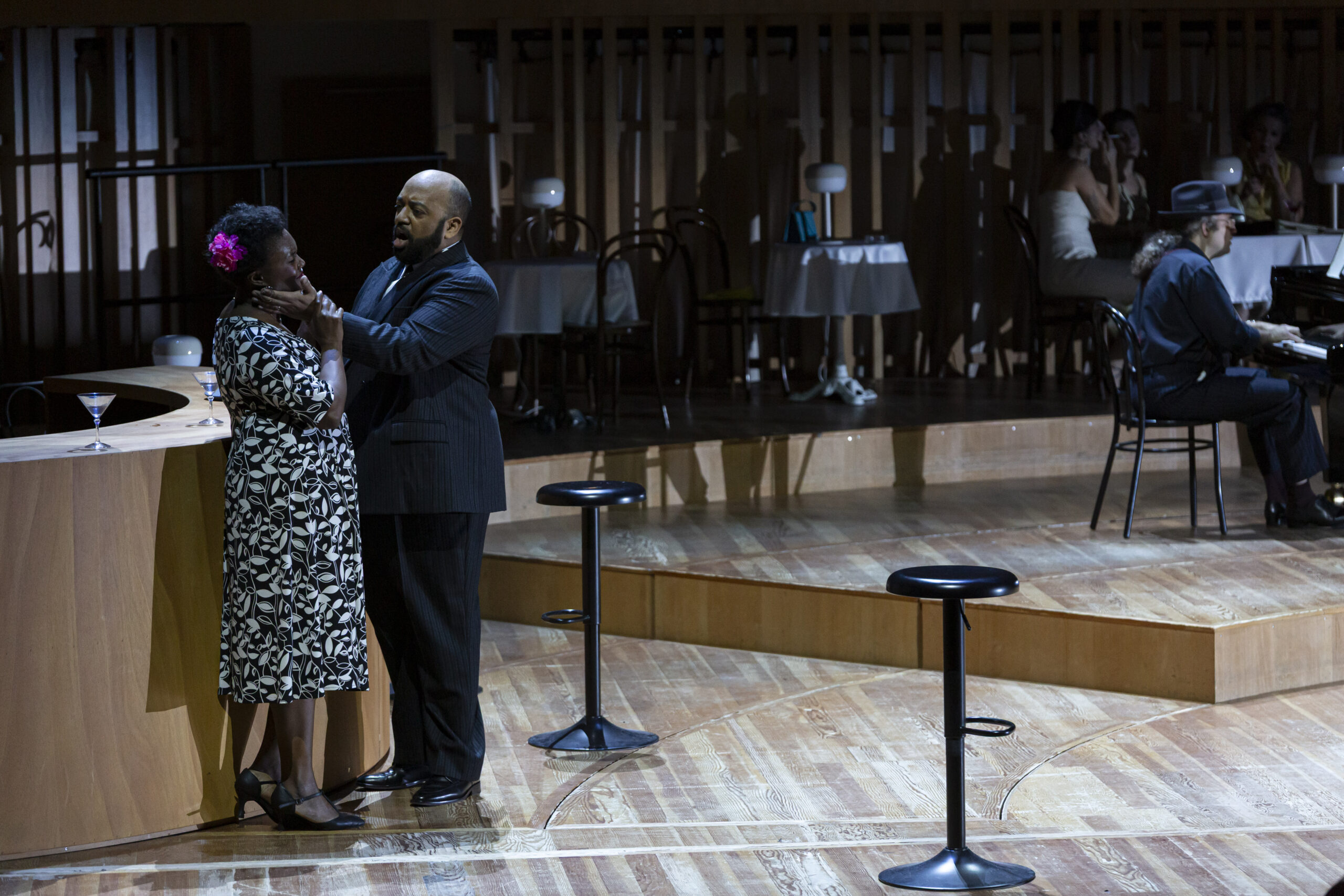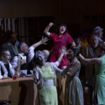 Ce passage de flambeau se fait quasi naturellement car aux États Unis d’Amérique, la ségrégation raciale a duré pendant plusieurs décennies ; et même encore de nos jours elle prend des formes plus insidieuses. Côté décors on passe des rues des taudis de Charleston – Caroline du sud, à un bar de jazz des années 1950. Et l’on retrouve cette vie grouillante, festive, désordonnée, la même quelque soit l’époque. Les costumes, tous issus de l’inépuisable réserve de l’Opéra de Bordeaux, vont comme des gants à l’ensemble des artistes présents sur le vaste plateau de l’auditorium de Bordeaux. La belle mise en espace de Emmanuelle Bastet et de Tim Northam, qui est aussi en charge des costumes, fait parfaitement ressortir la folie douce qui règne aussi bien dans les taudis de Charleston de 1920 que dans le bar jazzy de 1950 malgré la ségrégation et le règne de la drogue et de la prostitution.