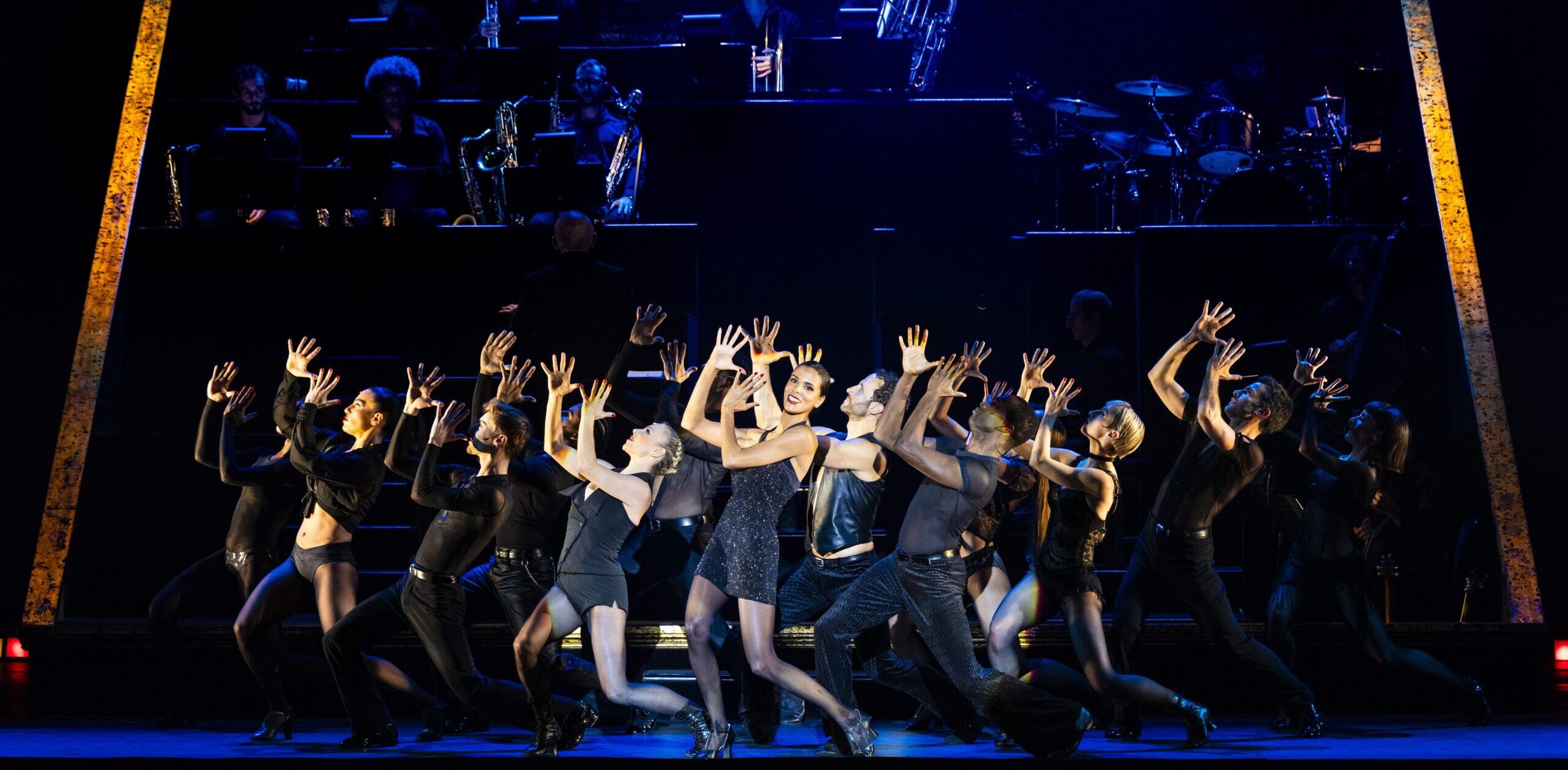 « Mesdames, messieurs, bienvenue, vous allez assister à une histoire de meurtre, de cupidité, de corruption, de violence, de manipulation, d’adultère et de trahison, toutes ces choses qui sont si chères à notre cœur ». Le ton est donné dès le début du spectacle ! Accompagné au centre d’un orchestre de cuivres exceptionnel qui interagit parfois avec les personnages, sur une scène minimaliste bordée de noir, le casting nous transporte dans une prison pour femmes qui sont toutes des meurtrières. La configuration du Casino de Paris demeure classique : l’orchestre jazz trône sur des gradins face au public, on peut boire et manger dans la salle. Ce qui fait que tout contribue à cette atmosphère cabaret déglinguée et de bas résille un peu mal famés. Les danseurs évoluent sur le devant de la scène, et les jeux de lumière sculptent la narration – notamment des rayures pour figurer la prison. C’est sombre, noir et cynique, avec un rapport aux médias qui n’a pas bougé d’un iota aujourd’hui. Néanmoins, il y a de la tendresse, notamment chez Amos, le « Monsieur Cellophane » et mari le plus transparent du monde (excellent Pierre Samuel) et aussi un show-business qui se regarde avec lucidité et un brin de fierté !