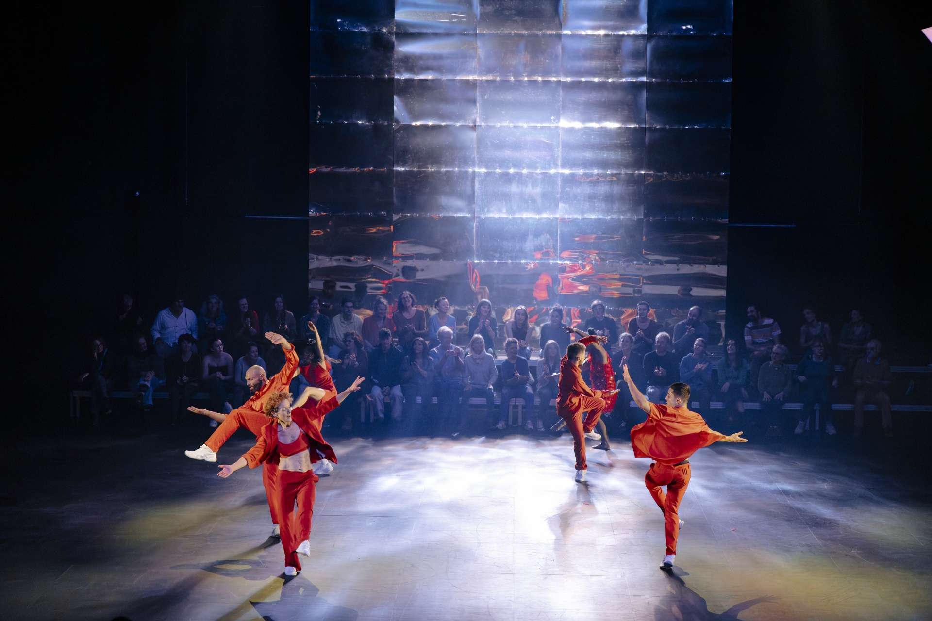 Au fil du spectacle, les interprètes semblent flotter un peu, le sol brillant et les pantalons reflétant la lumière leur donnant des allures de patineurs, sur glace ou à roulettes. Les pieds restent constants, tandis que le buste et les jambes deviennent le moteur de la danse. Marco Da Silva Ferreira nous emmène dans ce qu’il sait faire de mieux : faire bouger un groupe d’interprètes à fond. Les pas du début sont dépassés, les mouvements s’accélèrent, et les interprètes prennent des allures de mannequins à fond sur un podium de fashion week. Les épaules vont en arrière, les têtes roulent, le rythme s’accélère puis ralentit, avec une précision impressionnante.