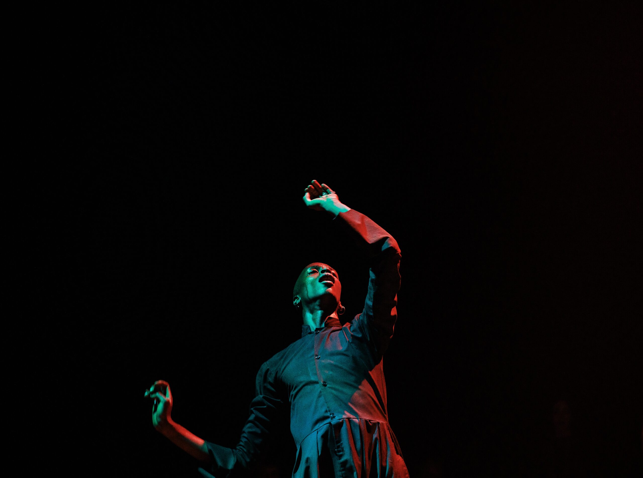 Oui, la pièce reste une danse répétitive, mais le geste évolue vers d’autres mouvements : des ondulations du buste, des bras qui se libèrent, dans un style qui emprunte autant au combat qu’à la culture ballroom. C’est extrêmement entêtant et addictif. On a envie de les rejoindre, de faire comme eux et elles. Les pieds continuent de répéter le même petit pas, qui avance peu, glisse à peine. On observe un pied pointé vers l’avant qui glisse vers l’arrière pendant que l’autre reste à plat.