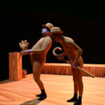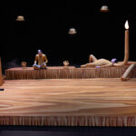 On est au théâtre, mais la scène s’ouvre sur un gros plan très cinématographique : le visage de Guillaume Drouadaine, comédien et danseur de la troupe Catalyse, accroche la lumière avec allure, dans le mystère de son regard d’une douceur infinie. A mesure que la musique s’affirme et se dramatise, pointe son sourire, se libère son cou au rythme d’une tranquille respiration. Un prélude qui ne présage pas la suite du spectacle : coupure au noir, et voici que se révèle la scénographie et les costumes, éléments puissants du travail d’Yvan Clédat et Coco Petitpierre. Un quadrilatère comme espace de jeu, flanqué d’une petite estrade en fond de scène, aux soubassements festonnés. Ici, tout est de bois blond. Ou plutôt d’un contreplaqué ou vinyle imprimé douteux aux limites du kitsch, dont les nervures de bois envahissent tout : sol, tissus, objets, costumes… Guillaume Drouadaine et Fabien Coquil, aux justaucorps parfaitement assortis, se fondent littéralement dans le décor.