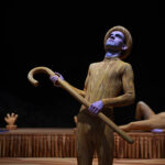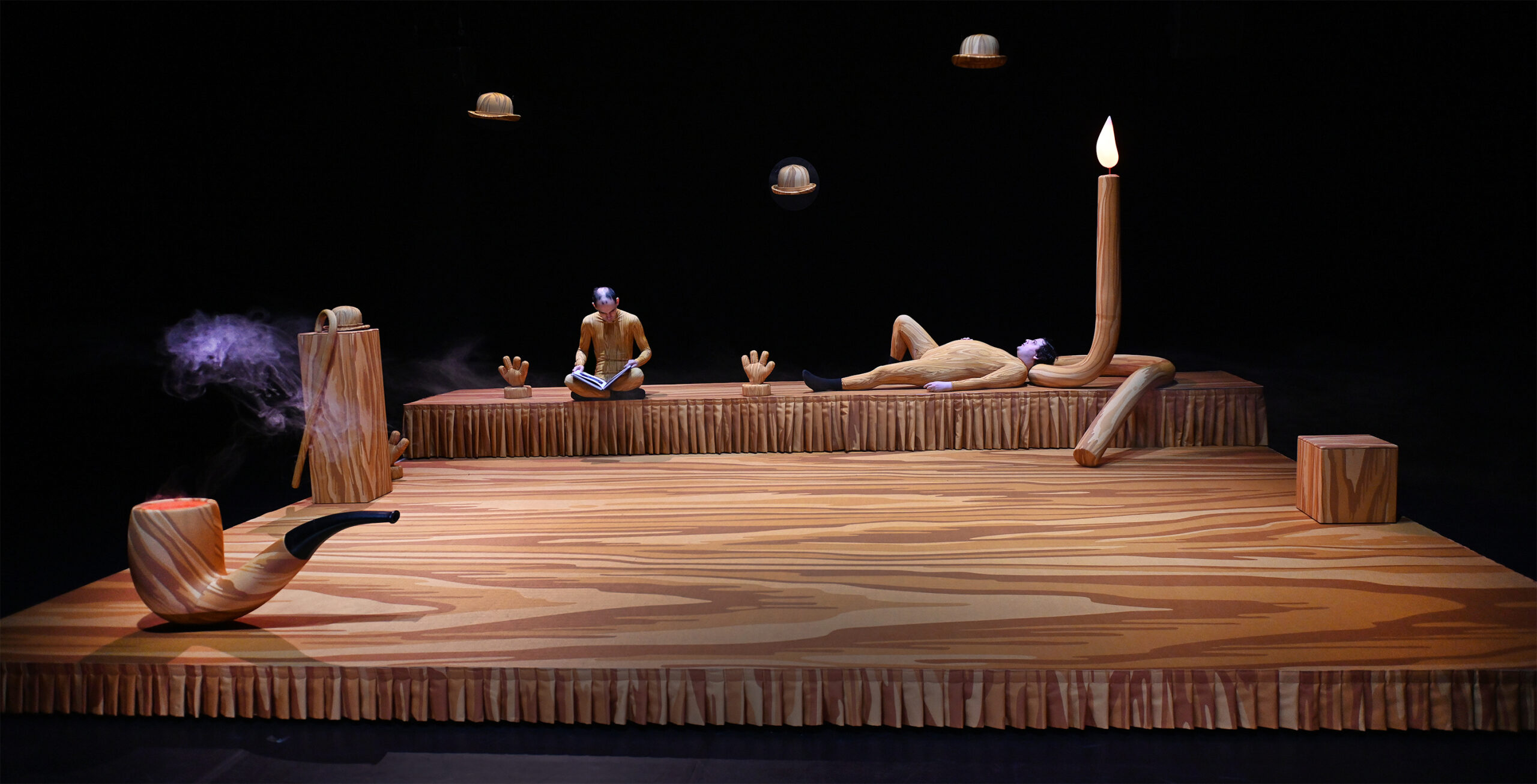 Dans cette harmonie poussée à son comble – jusqu’à en renverser la définition-même – c’est René Magritte qu’on invite : il est dans les pages du livre que tourne Guillaume, dans ses troublants questionnements, dans le chapeau melon, la canne ou la bougie ; il est dans le brillant exposé sur la pipe livré par Fabien. Il est également dans cette lenteur qui nous figure un rêve éveillé, une forme de monde parallèle où tout peut arriver. Là aurait pu s’arrêter la proposition du tandem de plasticiens chorégraphes, dont les précédentes œuvres traduisent un amour immodéré pour l’Histoire de l’Art. Nous voici dans une forme d’hommage à Magritte qui combine atmosphère, références, et univers plastique décalé propre à Clédat & Petitpierre.