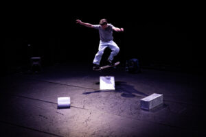 Le titre un peu long de la pièce What we talk about when we talk about skateboarding ou comment je suis devenu danseur nous interpelle immédiatement et annonce le programme. Le site internet de la compagnie présente cette pièce créée en 2025 comme suit : « Spectacle chorégraphique et parlé, un brin autobiographique, destiné aux adolescents (de tous âges). Cela parlera du skateboard, mais aussi de danse, du sens du défi et du conformisme ».