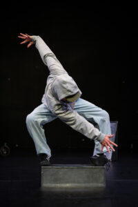 Le parcours atypique de Canteteau se caractérise par son travail « avec les notions d’équilibre, d’instabilité et de risque » (interview de novembre 2025 par W. Le Personnic dans la feuille de salle). Et on retrouve en effet ces notions dans ses solos où la danse flirte avec le cirque (il a une formation de jongleur). Mais leur origine vient bien du skateboard qu’il a pratiqué à partir de l’âge de 16 ans : « Si tout le monde décide qui tu es, nous dit sa voix enregistrée, tu le deviens ». Il nous apprend ainsi que ses camarades de classe et lui étaient « tous nuls à l’école » et lui « un cas désespérant ». À écouter son parcours que nous narre sa voix off – tandis qu’il fait alterner devant nous évolutions, arrêts et moments de repos – on comprend vite qu’il a dû résister pour s’imposer. Cette pratique du skateboard l’a construit et lui a donné confiance en lui : « La première personne à convaincre, c’est toi-même ». Il a dû s’y replonger et réapprivoiser son ancienne pratique, travailler sur ses archives personnelles, « qui ont agi comme des déclencheurs et révélé une mémoire corporelle très vive ».